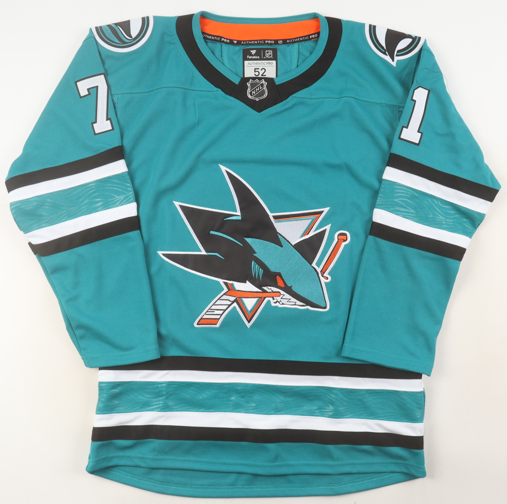 Fanatics jersey with everything sewn on, size 52. Hand-signed and inscribed by Macklin Celebrini (San Jose Sharks). Please note, there is a stain on the players name.