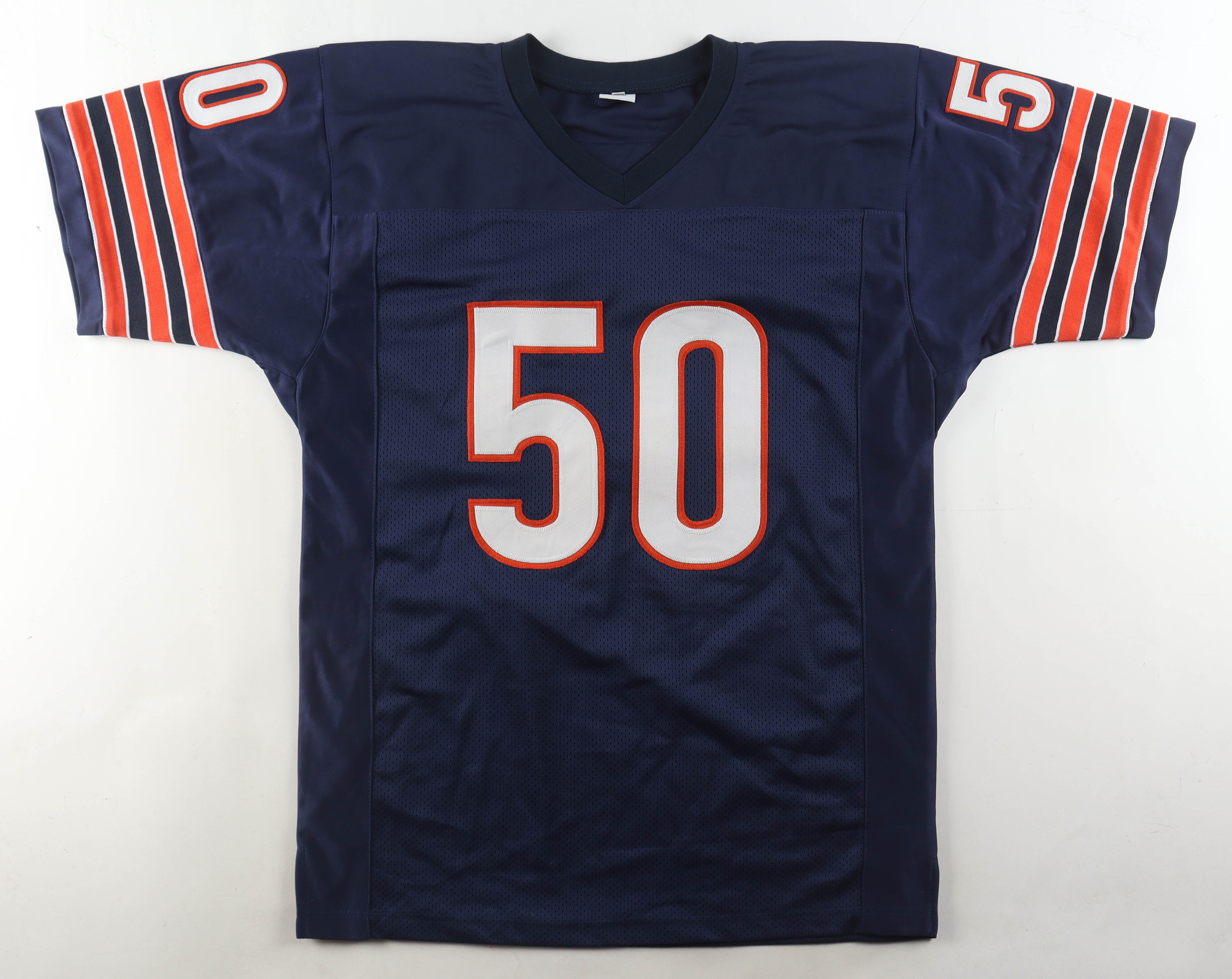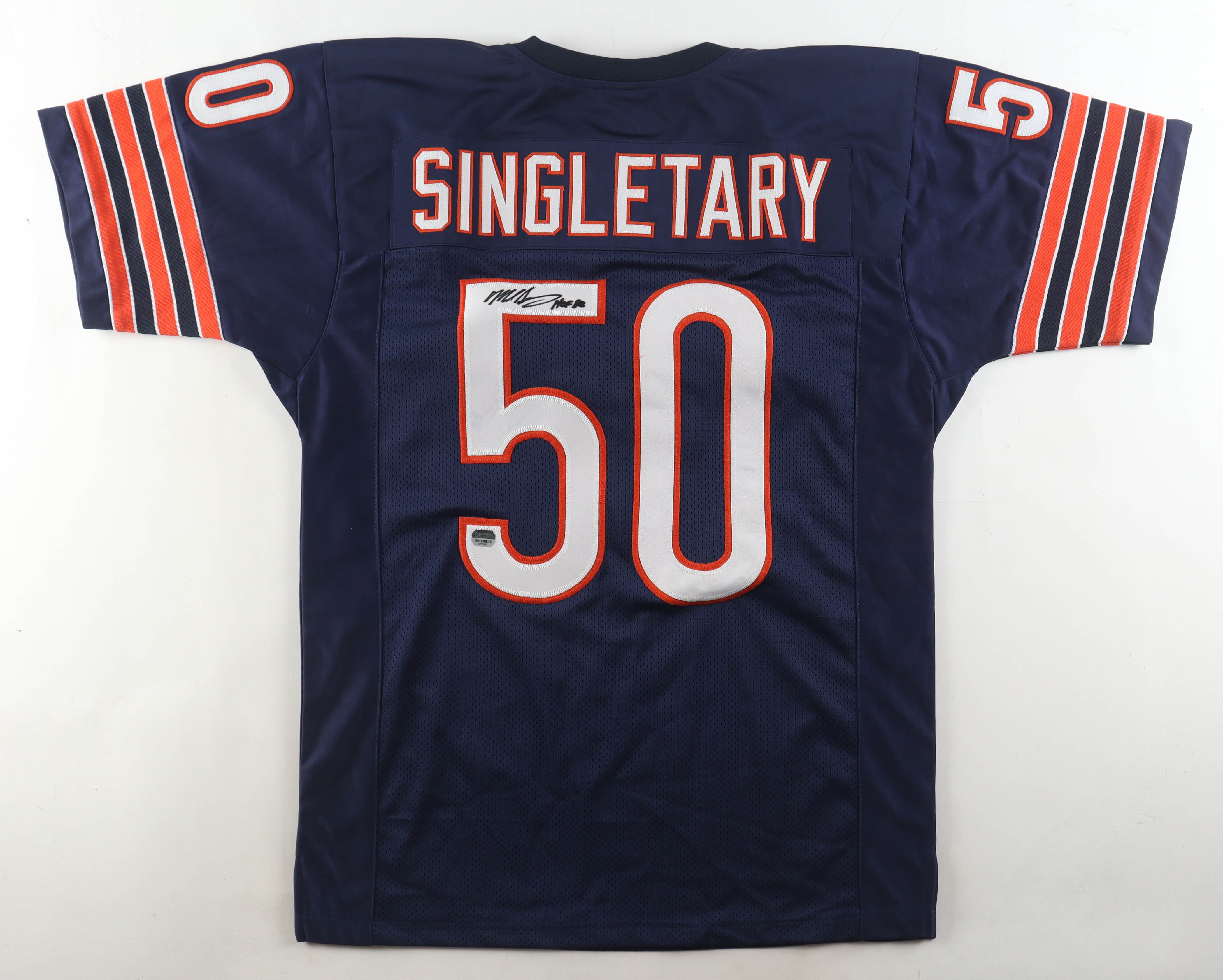 Custom jersey with everything sewn on, size L. Hand-signed and inscribed by Mike Singletary (HOF). Please note, glue is visible through the reverse number.