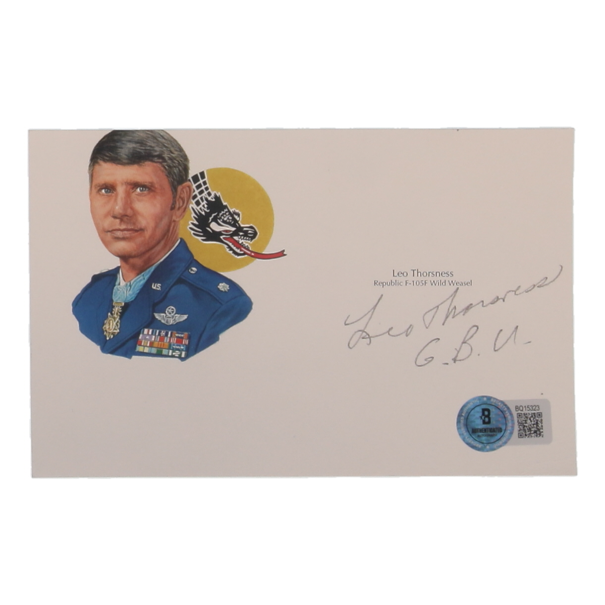 Leo Thorsness Signed 3.75x7.5 Cut with Portrait Inscribed "G.B.U." (Beckett)