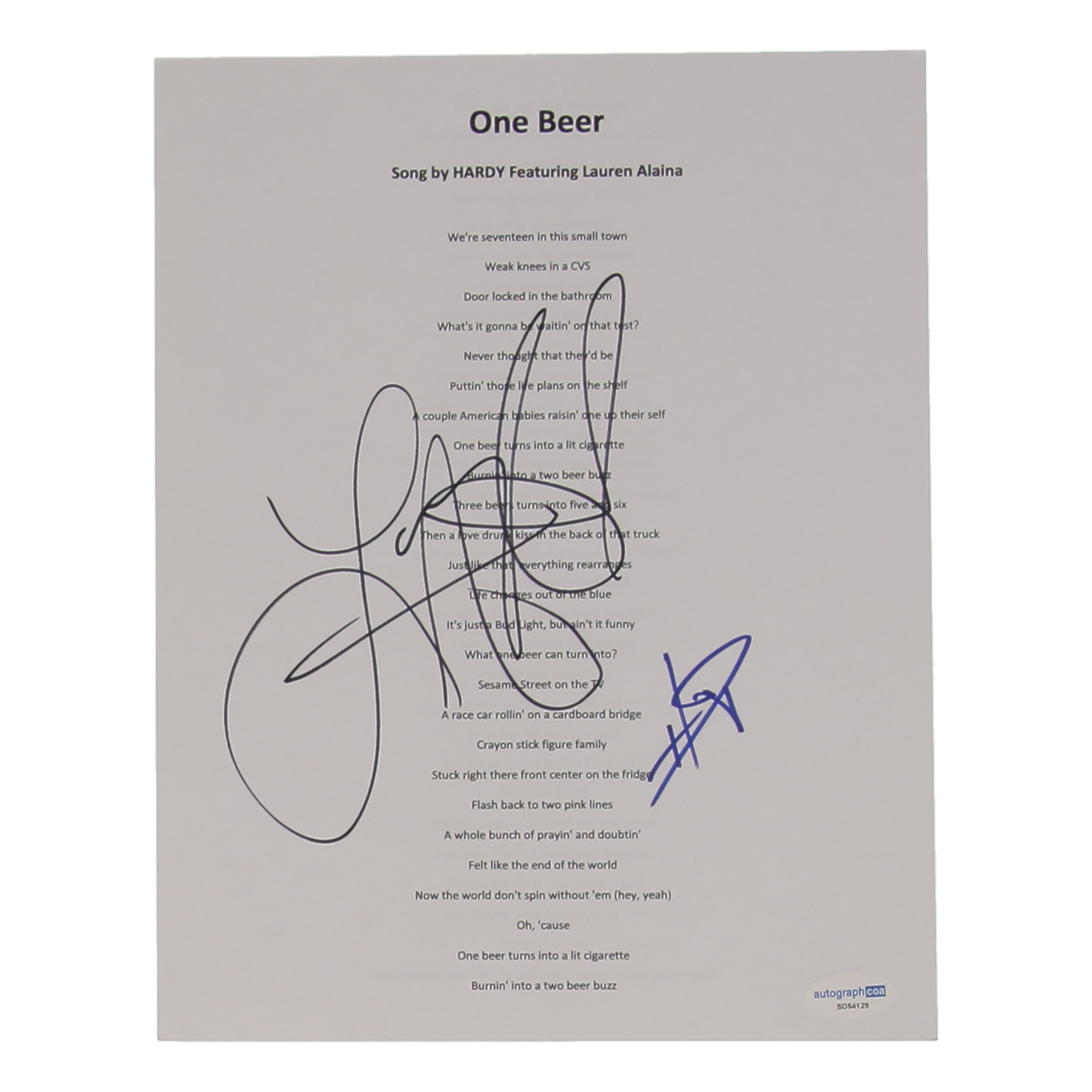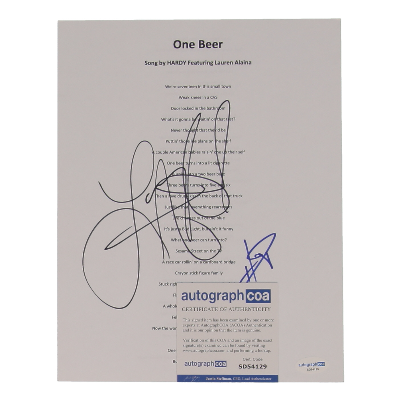 HARDY & Lauren Alaina Signed "One Beer" 8x10 Music Lyric Sheet (AutographCOA)