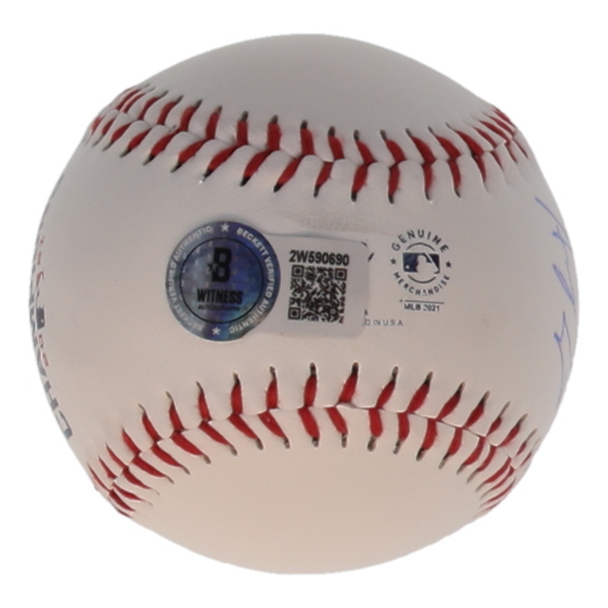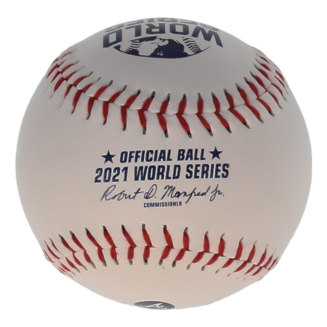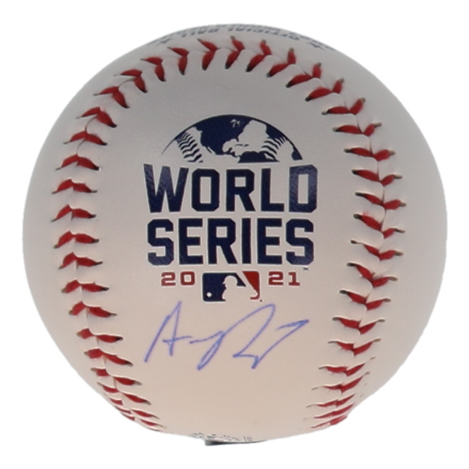 Rawlings Official 2021 World Series Baseball. Hand-signed by Austin Riley (Atlanta Braves). Please note, there are minor stains throughout the baseball.