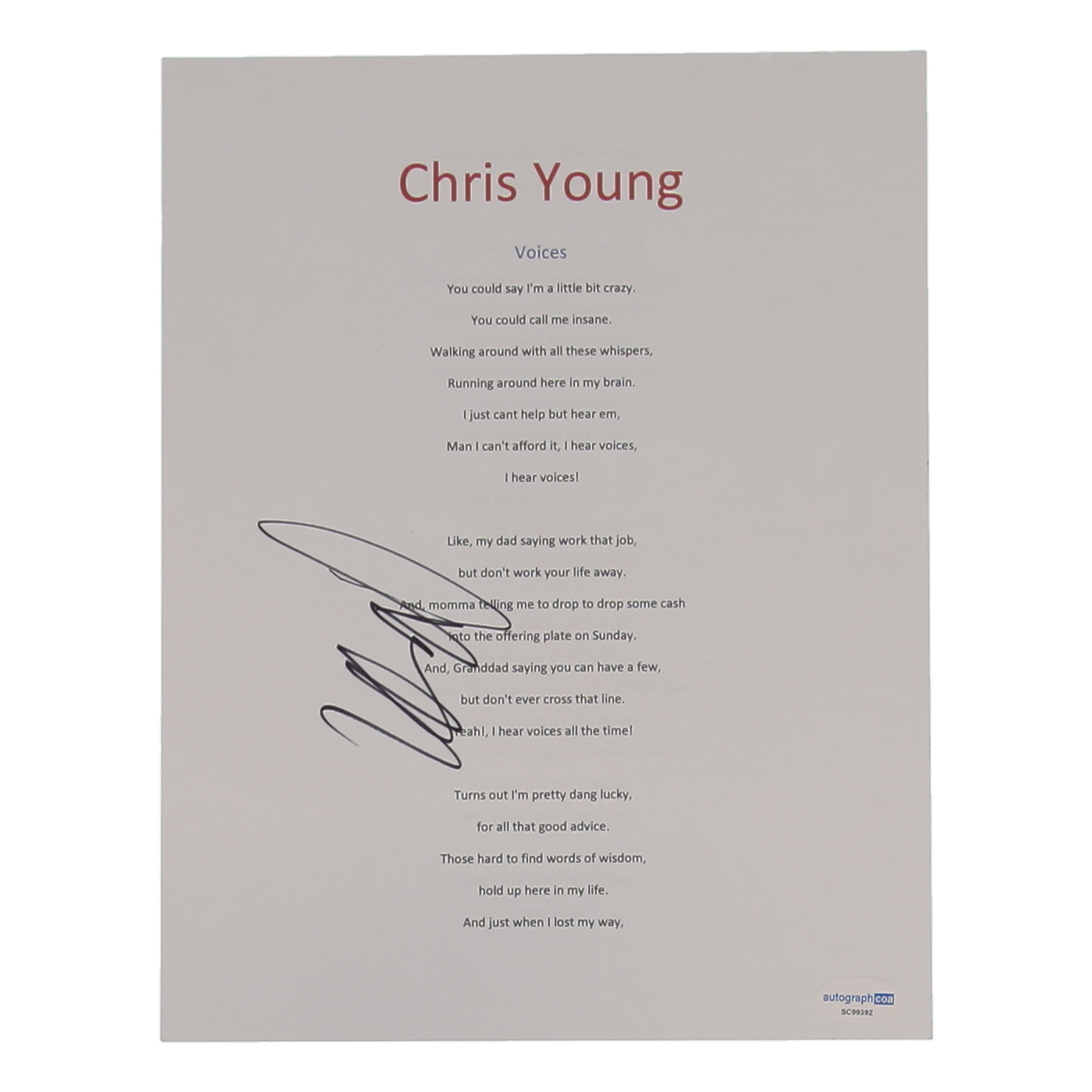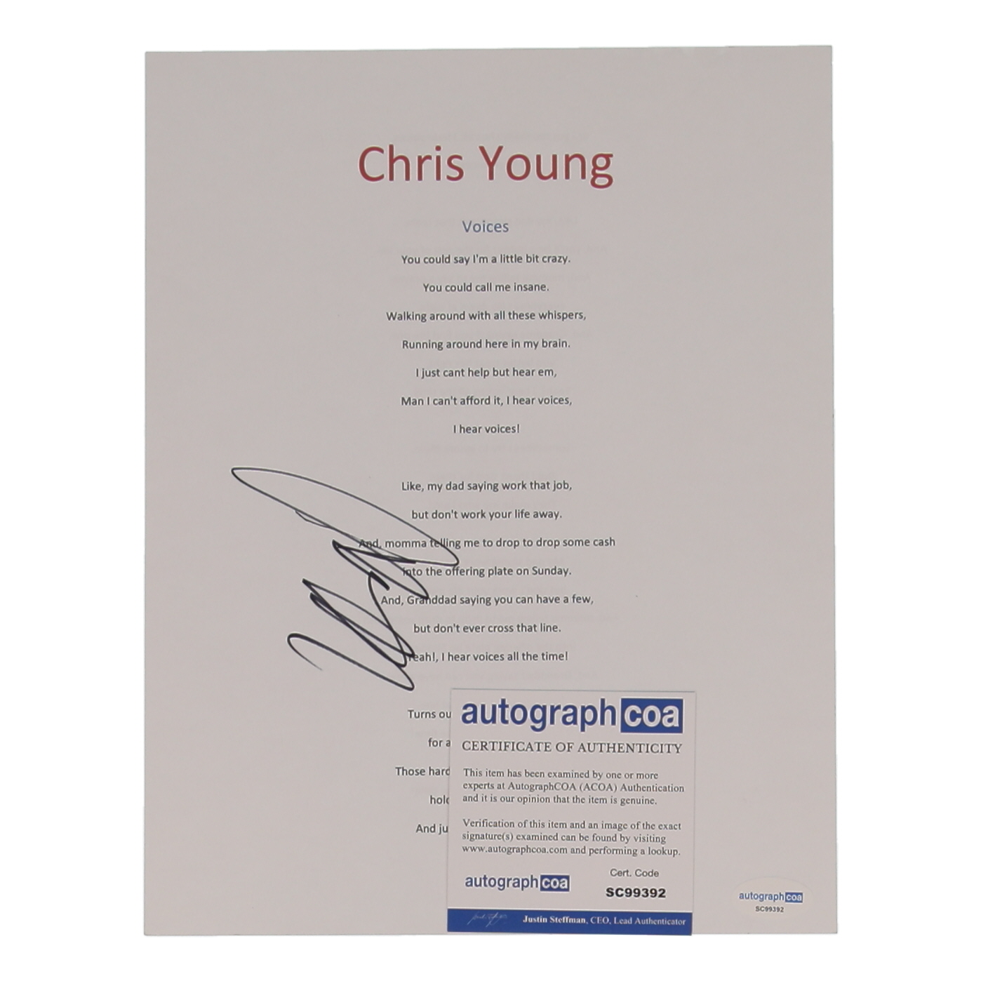 Chris Young Signed "Voices" 8x10 Music Sheet (AutographCOA)