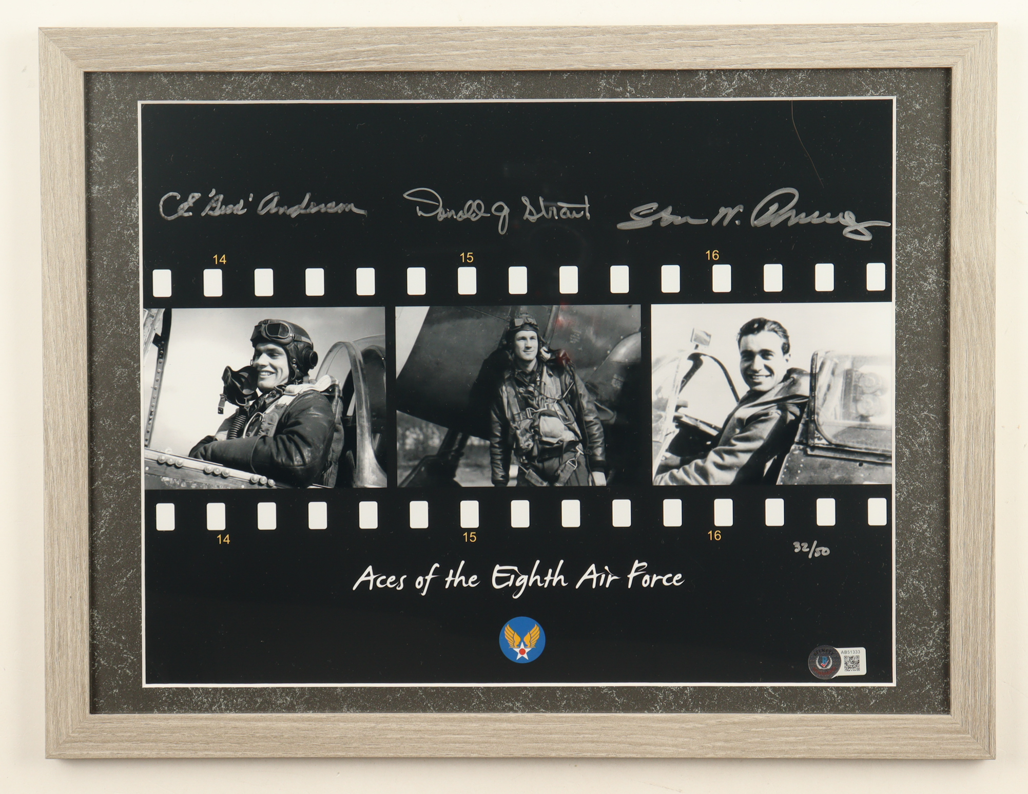 CE "Bud" Anderson, Donald Strait & Steve Pisanos Signed "Aces Of The Eighth Air Force" Custom Framed Photo Display (Beckett)