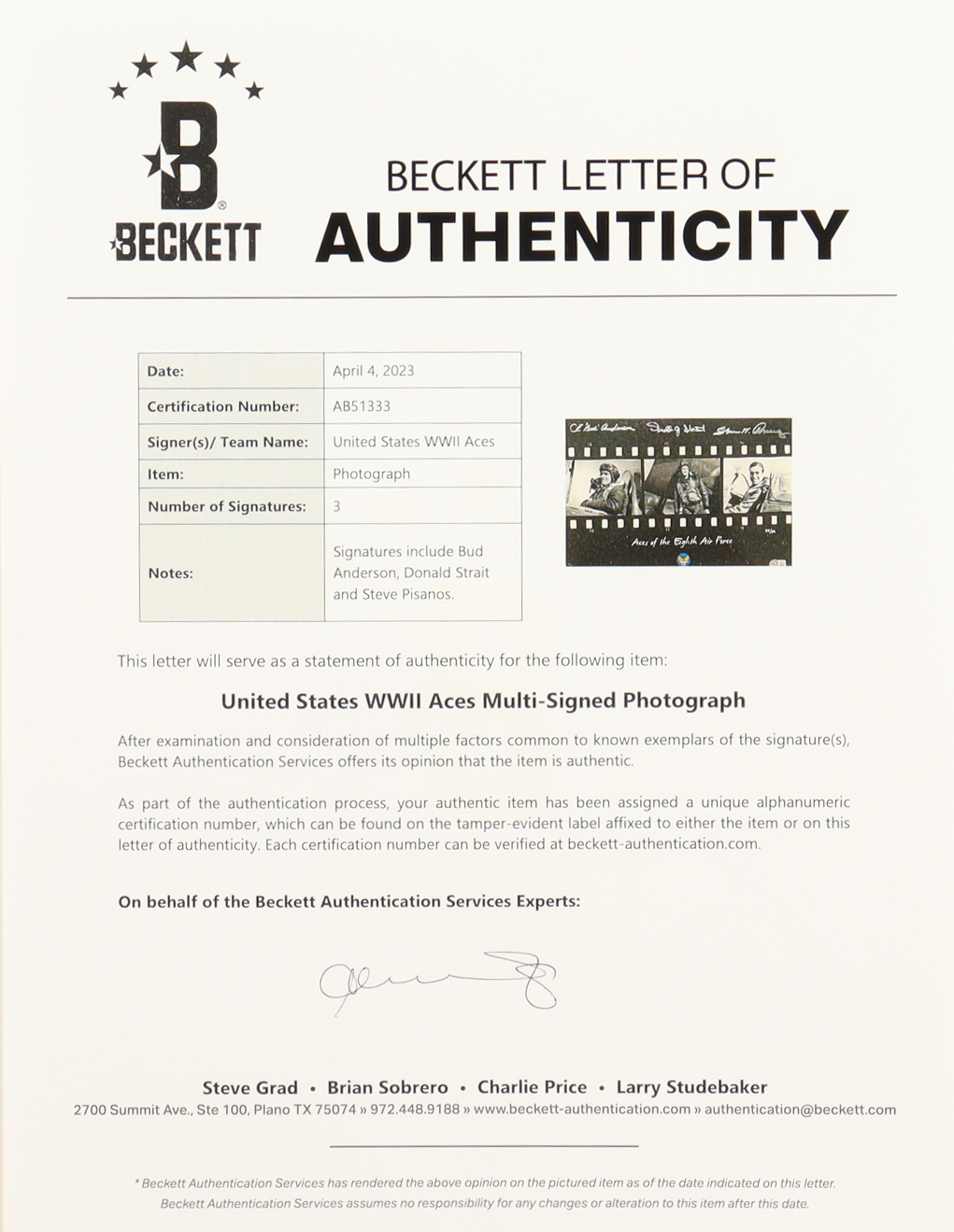 Custom frame measures approximately 13.25" x 17.25" in size and has been hand-signed by CE "Bud" Anderson (D. 2024), Donald Strait (D. 2015), and Steve Pisanos (D. 2016).