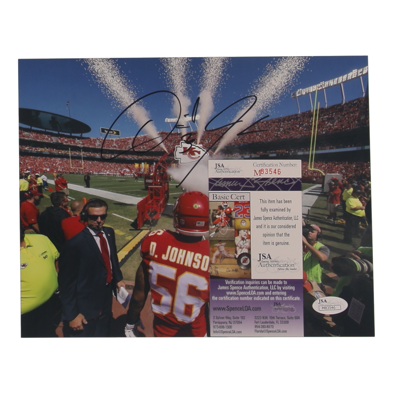 Photo measures 8" x 10" in size and has been hand-signed by Derrick Johnson (Kansas City Chiefs).