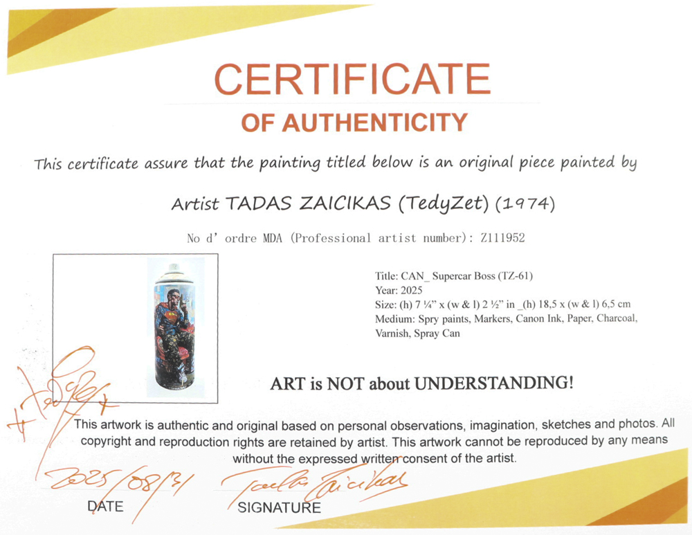 Spray can measures approximately 8" in height. Hand-signed by the artist, Tadas Zaicikas.