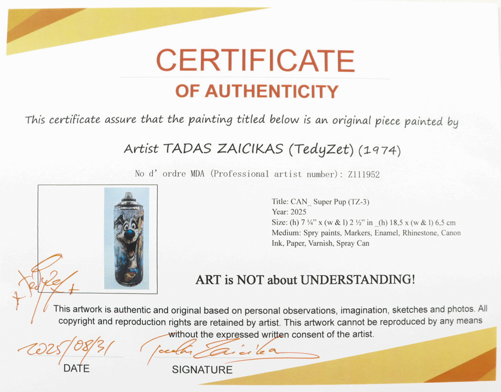 Spray can measures approximately 8" in height. Hand-signed by the artist, Tadas Zaicikas.