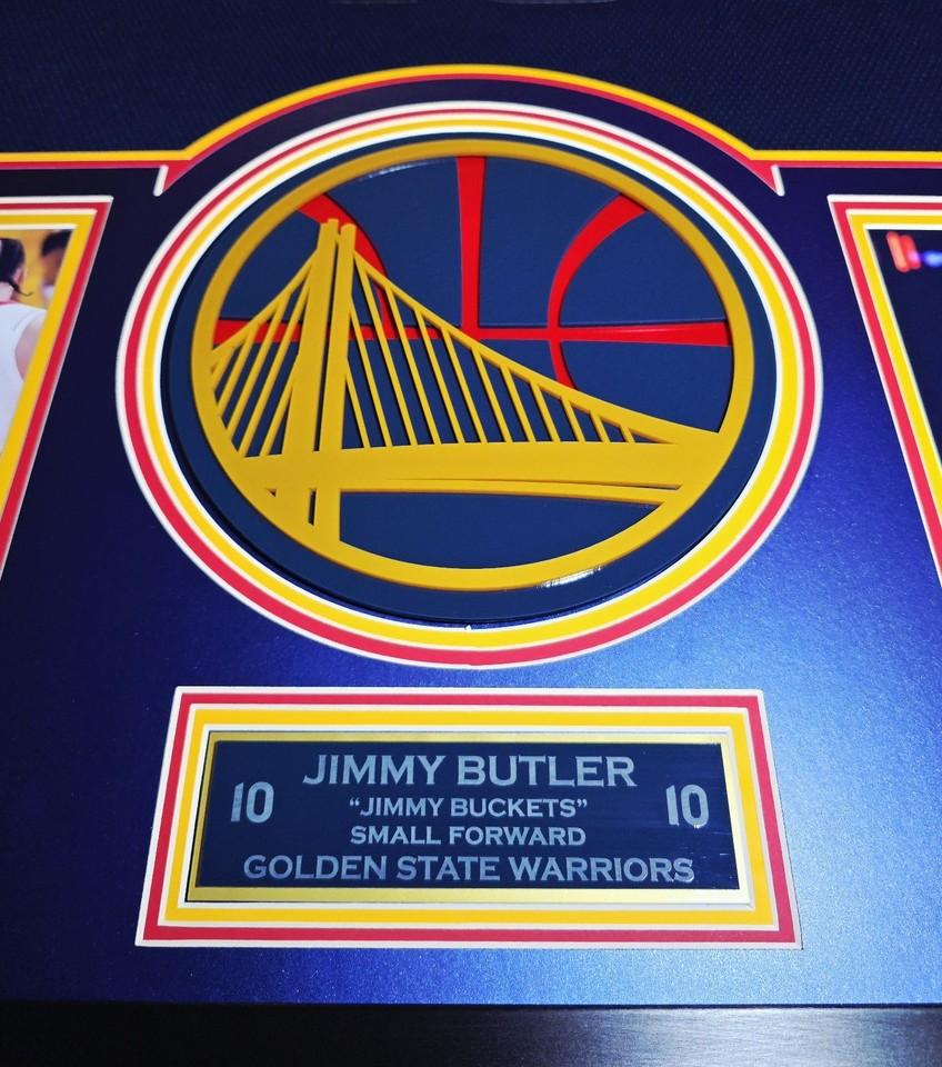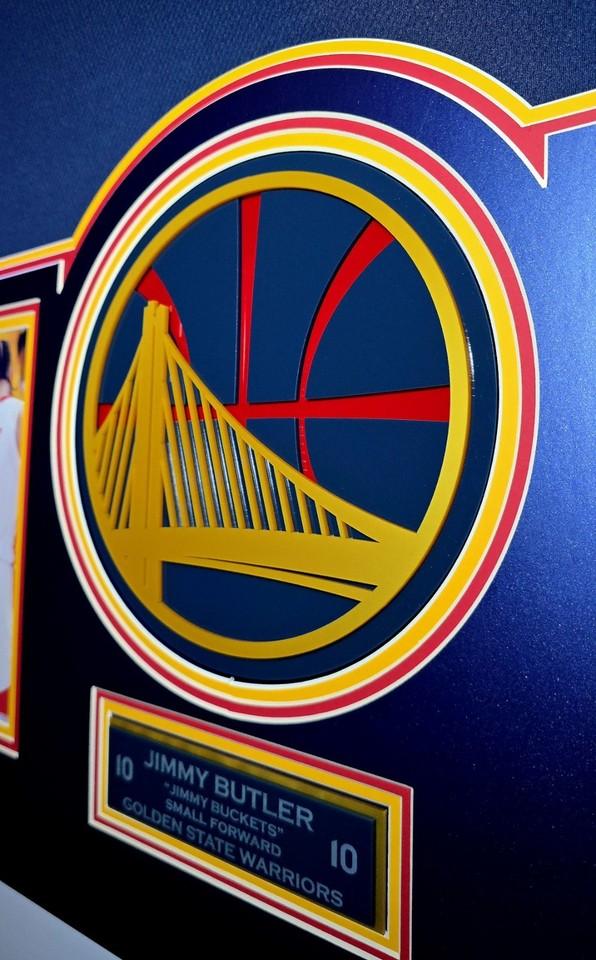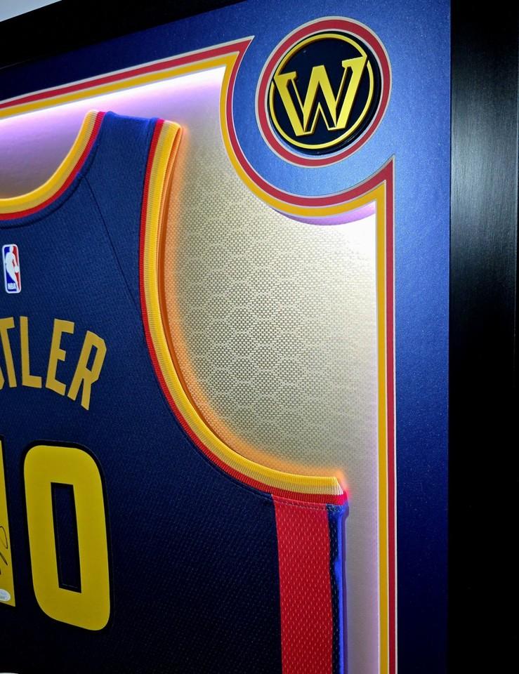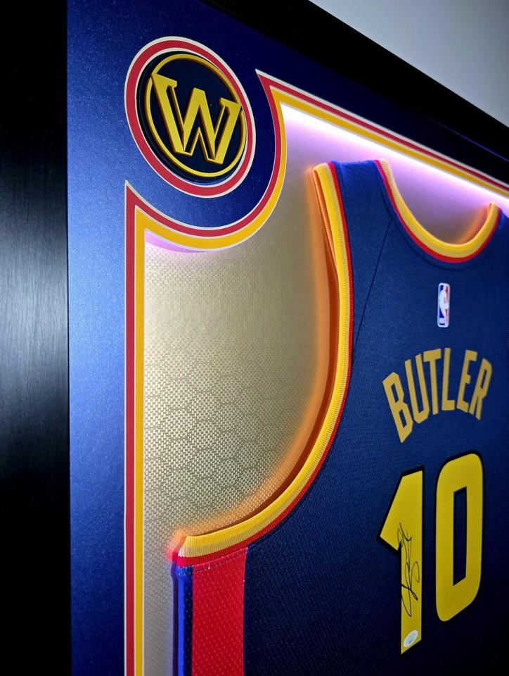 Custom frame measures 33" x 42" in size and comes installed with customizable LED backlighting. The frame features a Nike Limited jersey that has been hand-signed by Jimmy Butler (Golden State Warriors).