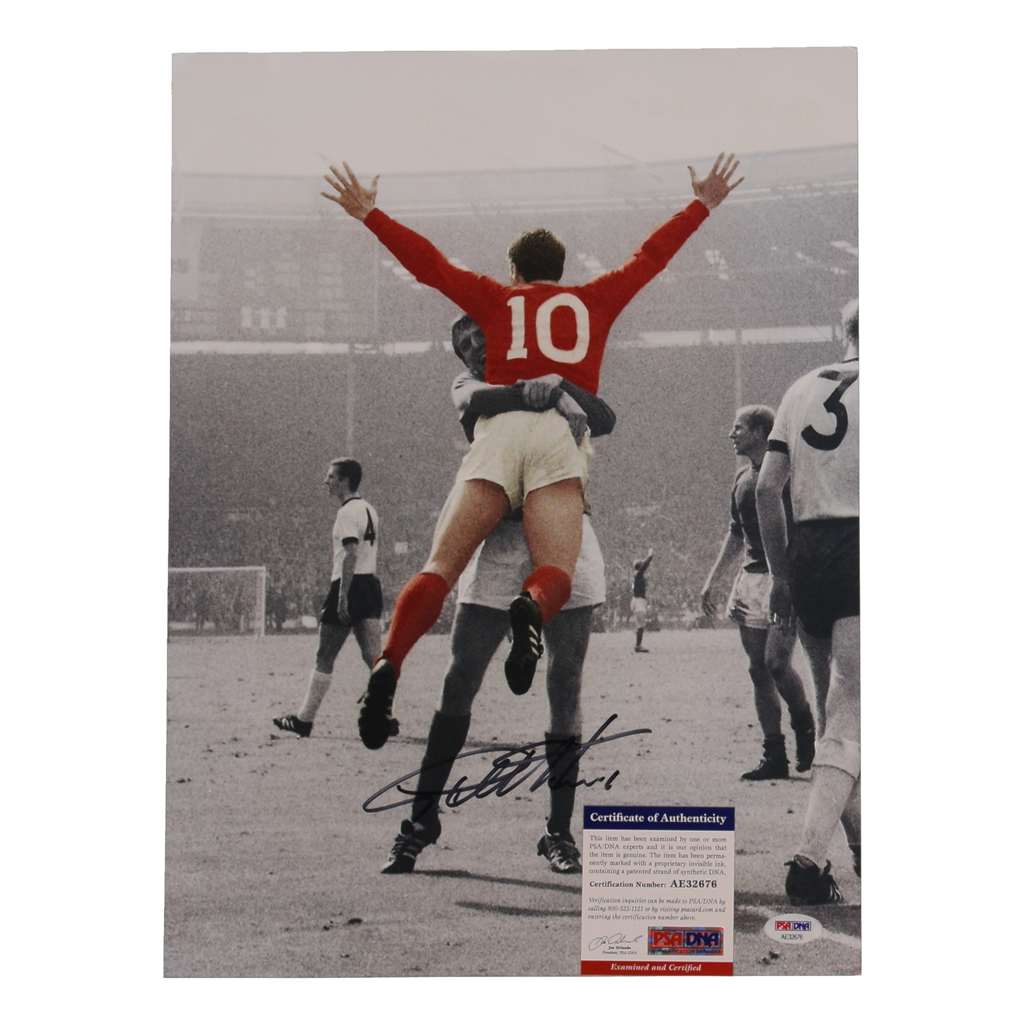Photo measures approximately 12" x 16" in size and has been hand-signed by Geoff Hurst.