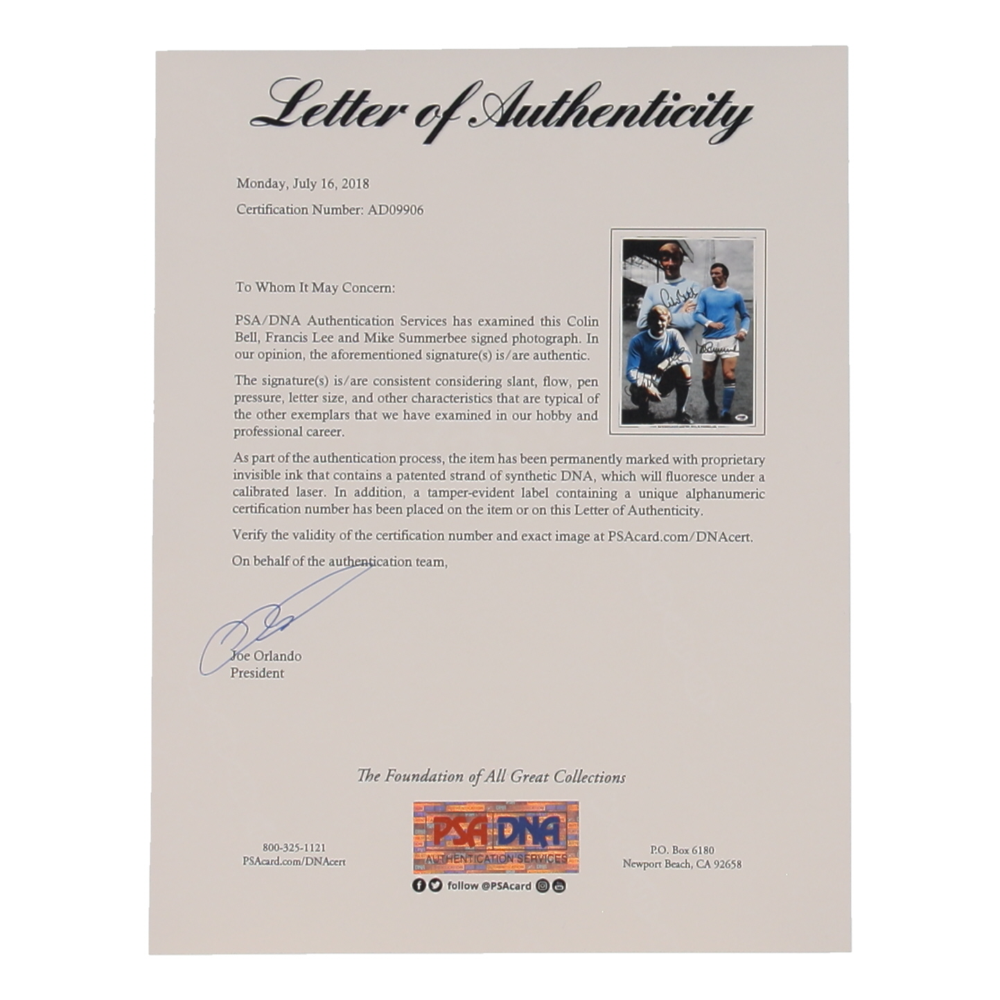 Colin Bell, Francis Lee & Mike Summerbee Signed Manchester City 12x16 Photo (PSA)