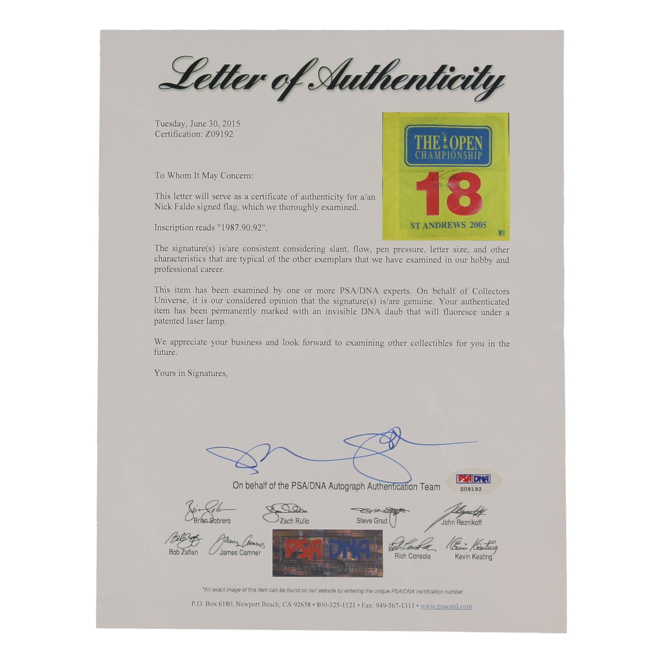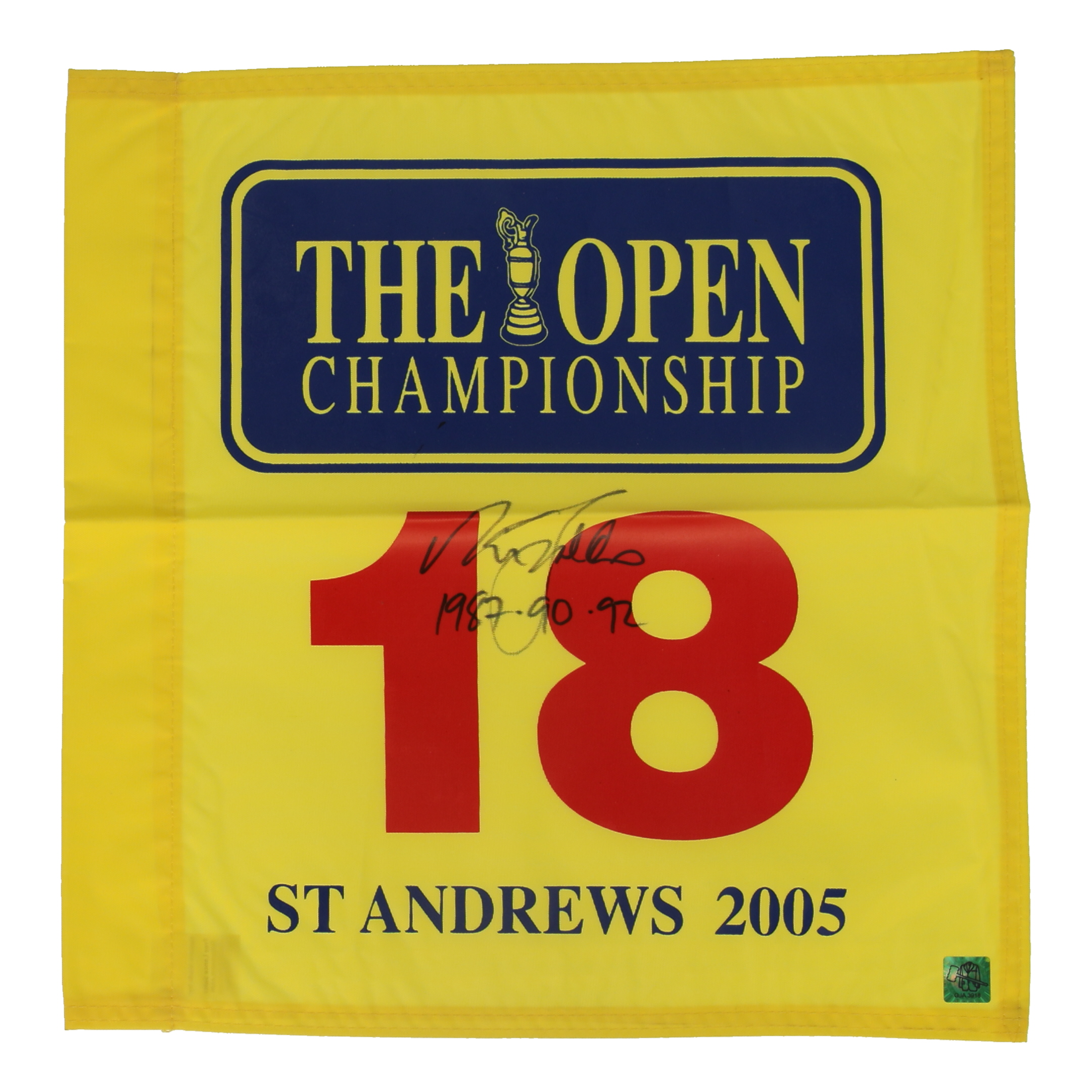 Nick Faldo Signed 2005 The Open Pin Flag Inscribed "1987, 90, 92" (PSA)