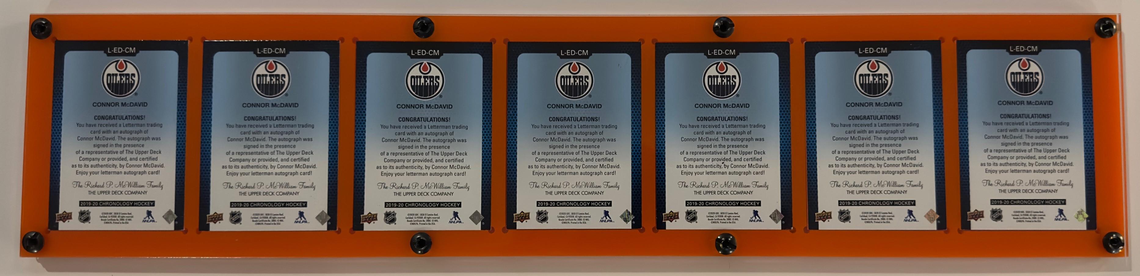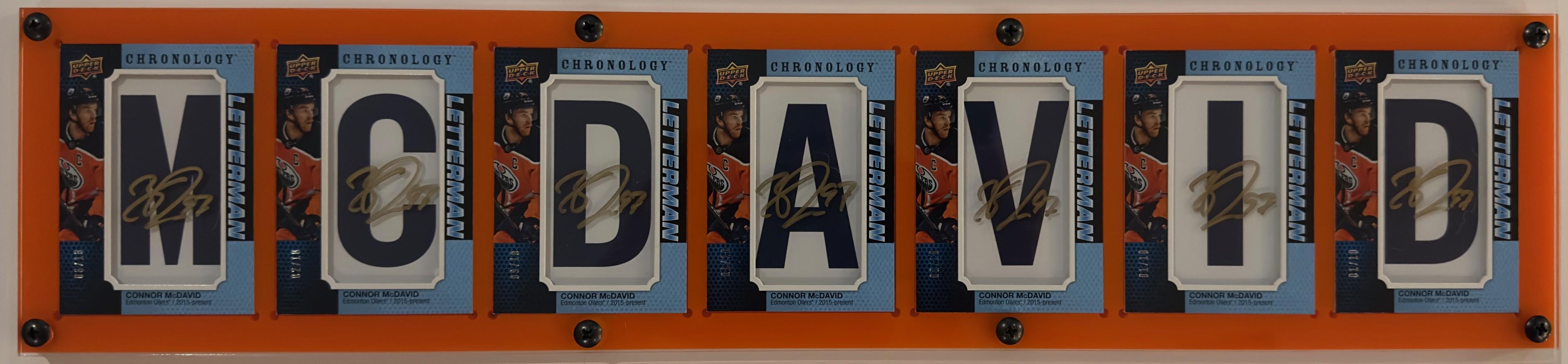 This listing features a complete set of Connor McDavid Letterman autos from 2019-20 Upper Deck Chronology. Each of the 7 autographed relic cards is numbered to just 10, and the set is displayed in a custom 3-D printed display case that allows for convenient display in your collection.