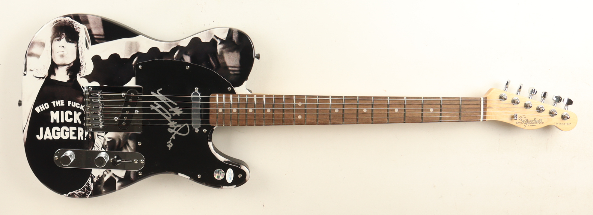 Squier by Fender full-size electric guitar has been hand-signed on the pickguard by Keith Richards.