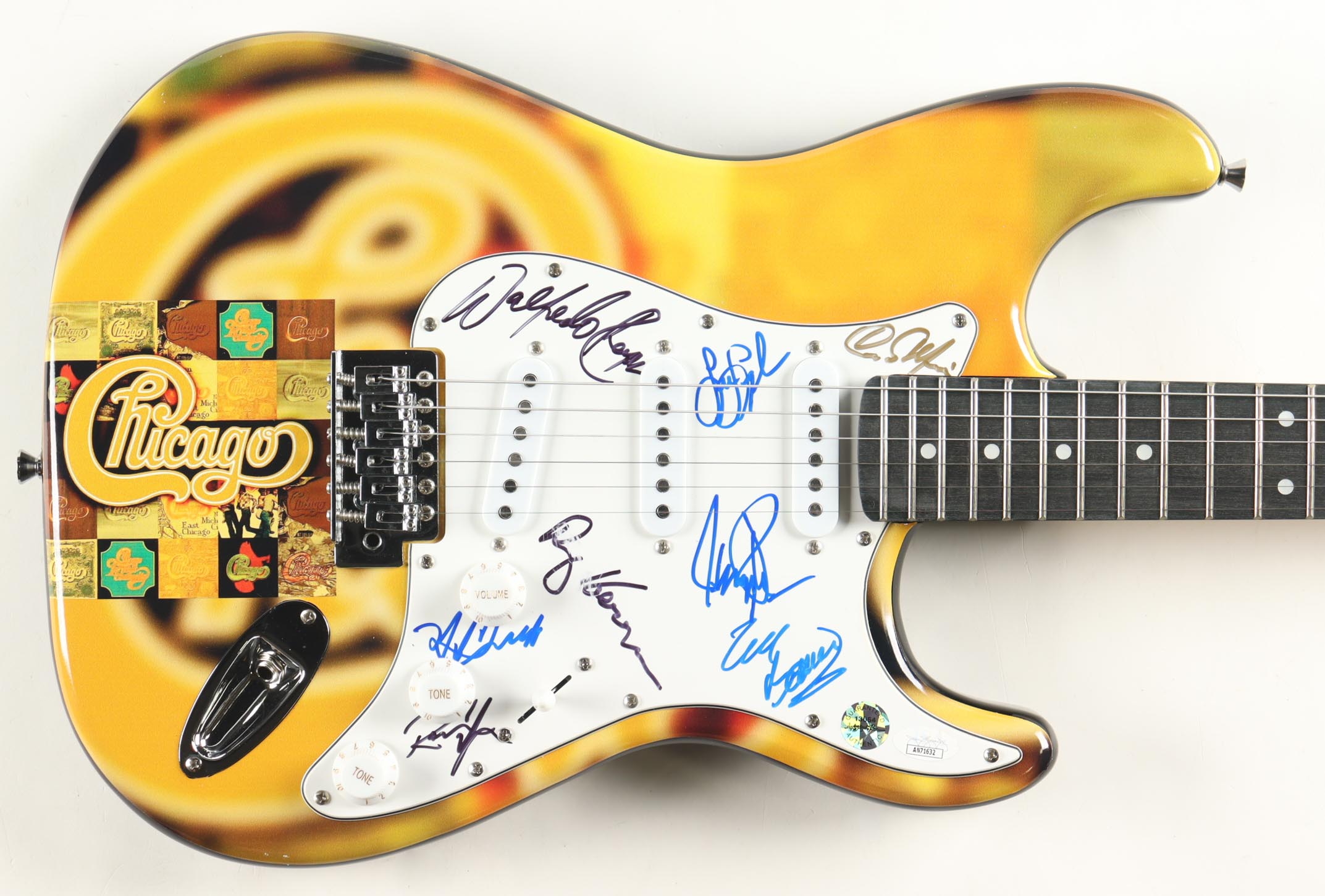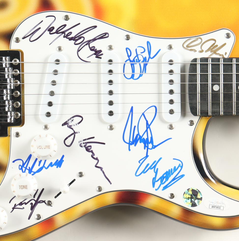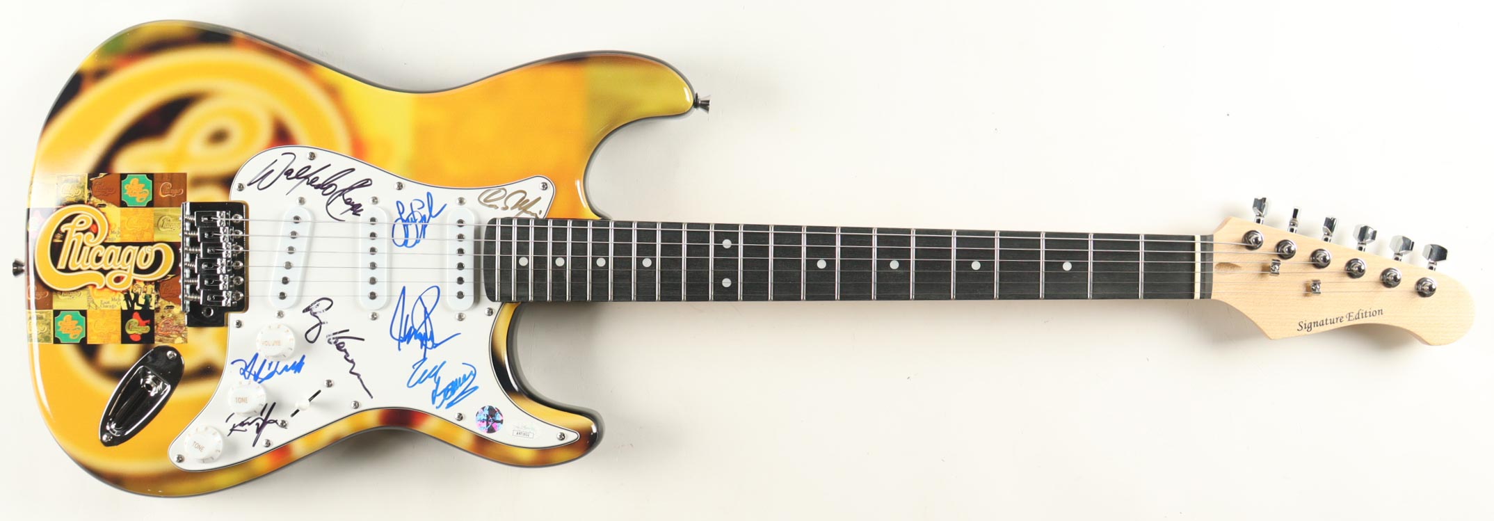 Custom Autograph Edition Stratocaster style electric guitar measures approximately 39" in length and has been hand-signed on the pickguard by Lee Loughnane (Trumpet), James Pankow (Trombone), Eric Baines, Walfredo Reyes Jr., Ray Herrmann, Ramon Yslas, Neil Donell, James Pankow.