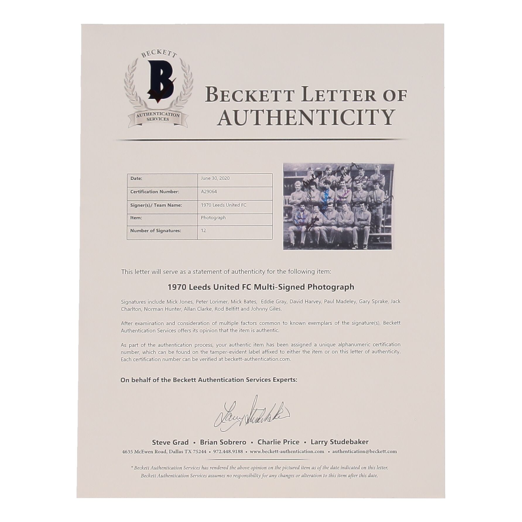 Photo measures approximately 8" x 10" in size. Hand-signed by (12) with Mick Jones, Peter Lorimer (D. 2021), Mick Bates (D. 2021), Eddie Gray, David Harvey, Paul Madeley (D. 2018), Gary Sprake (D. 2016), Jack Charlton (D. 2020), Norman Hunter (D. 2020), Allan Clarke, Rod Belfitt, and Johnny Giles.