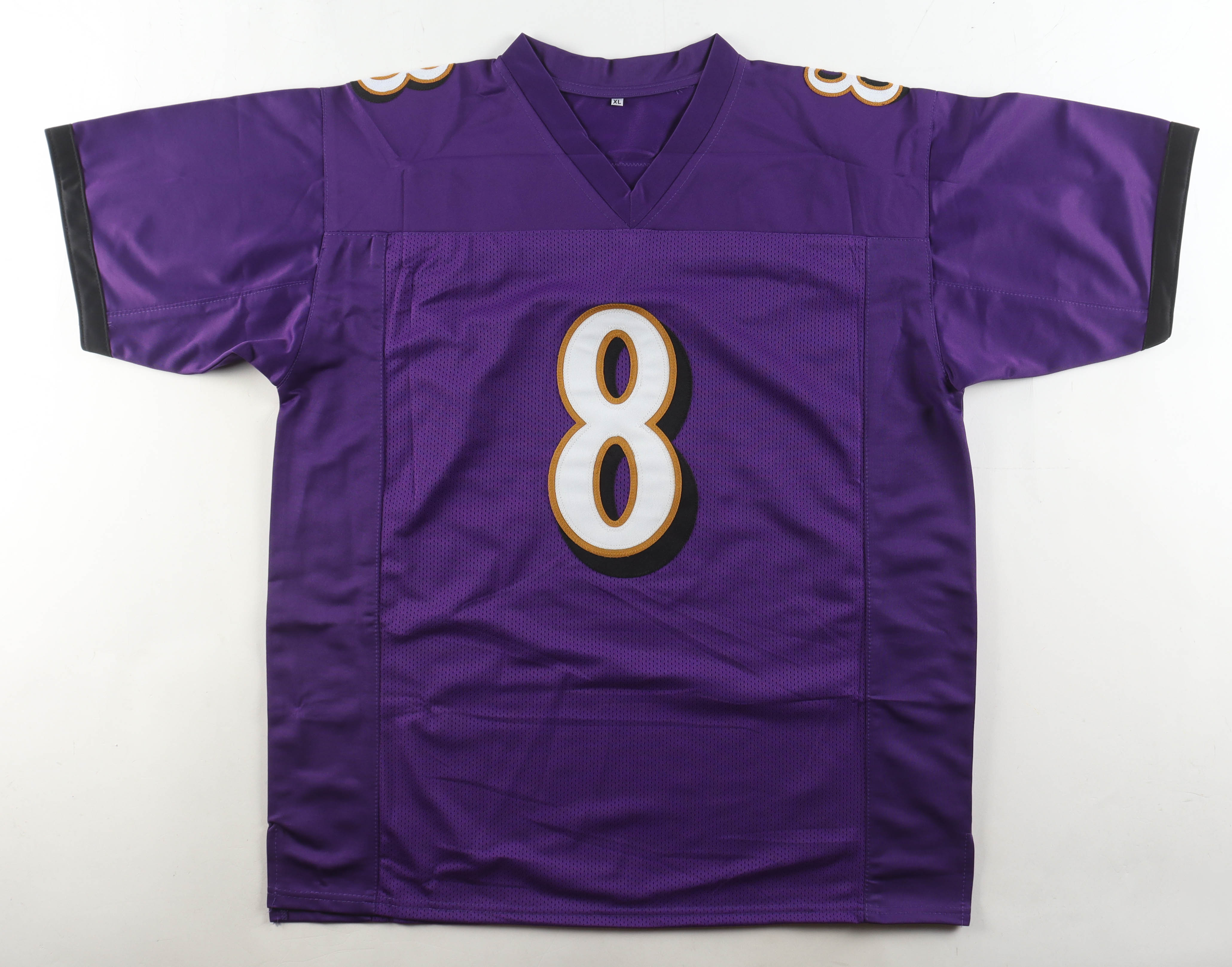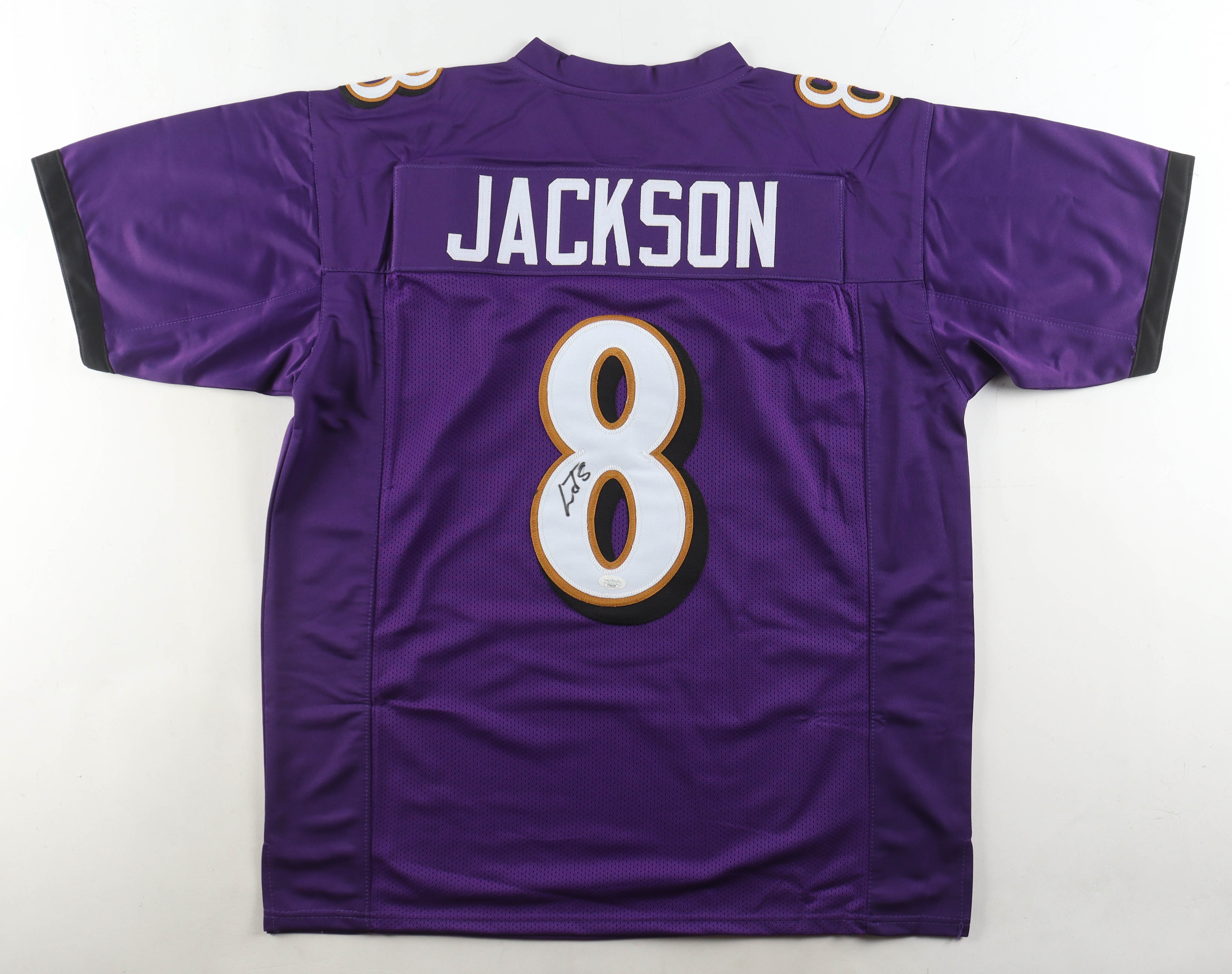Custom jersey with everything sewn on, size XL. Hand-signed by Lamar Jackosn.