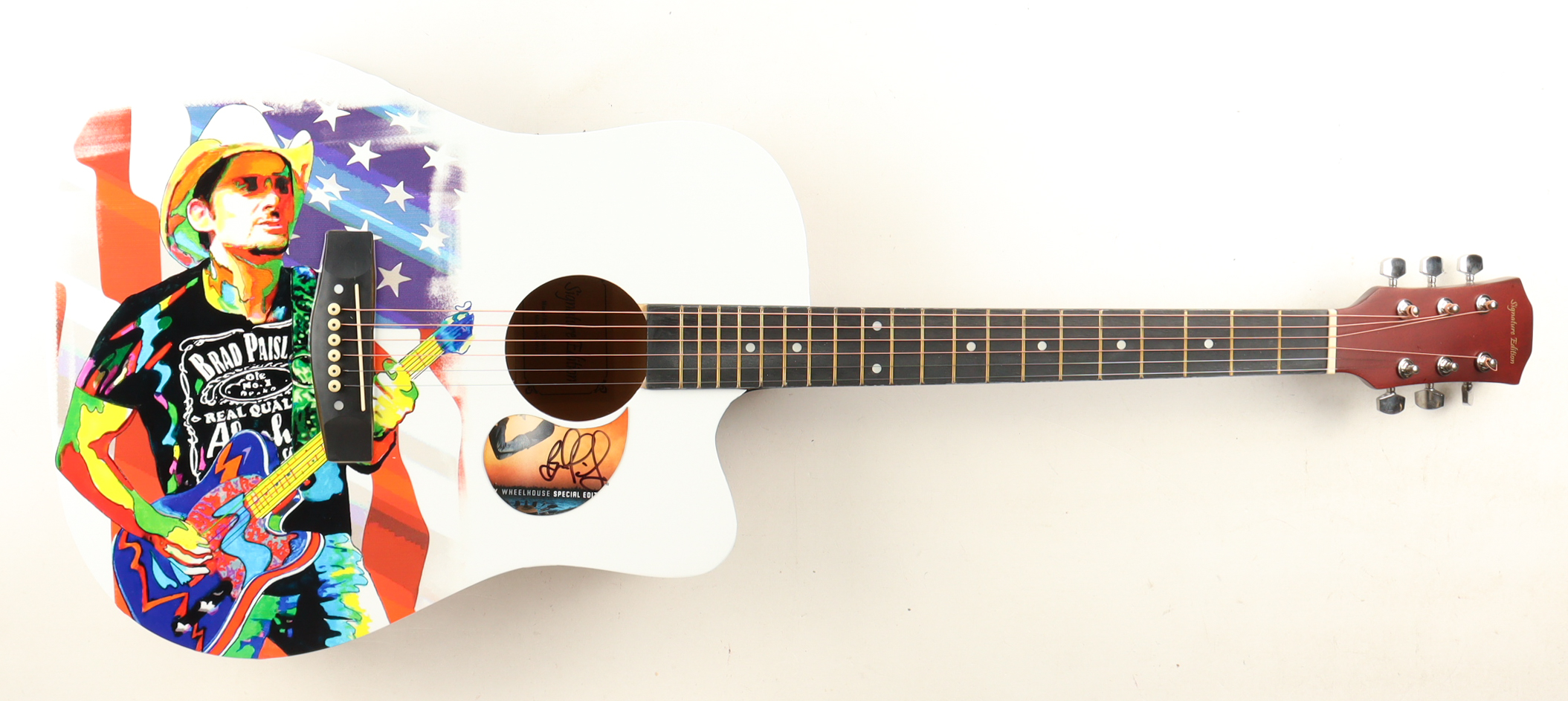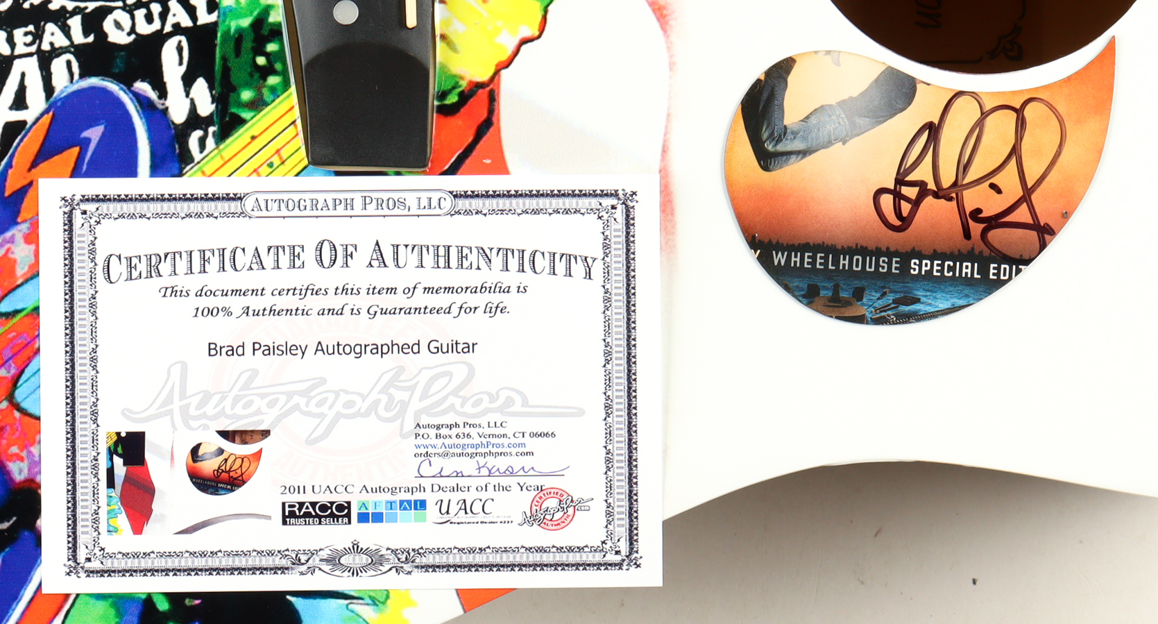 Signature edition acoustic guitar measures approximately 41" in length and has been hand-signed on a make shift pick-guard by Brad Paisley.