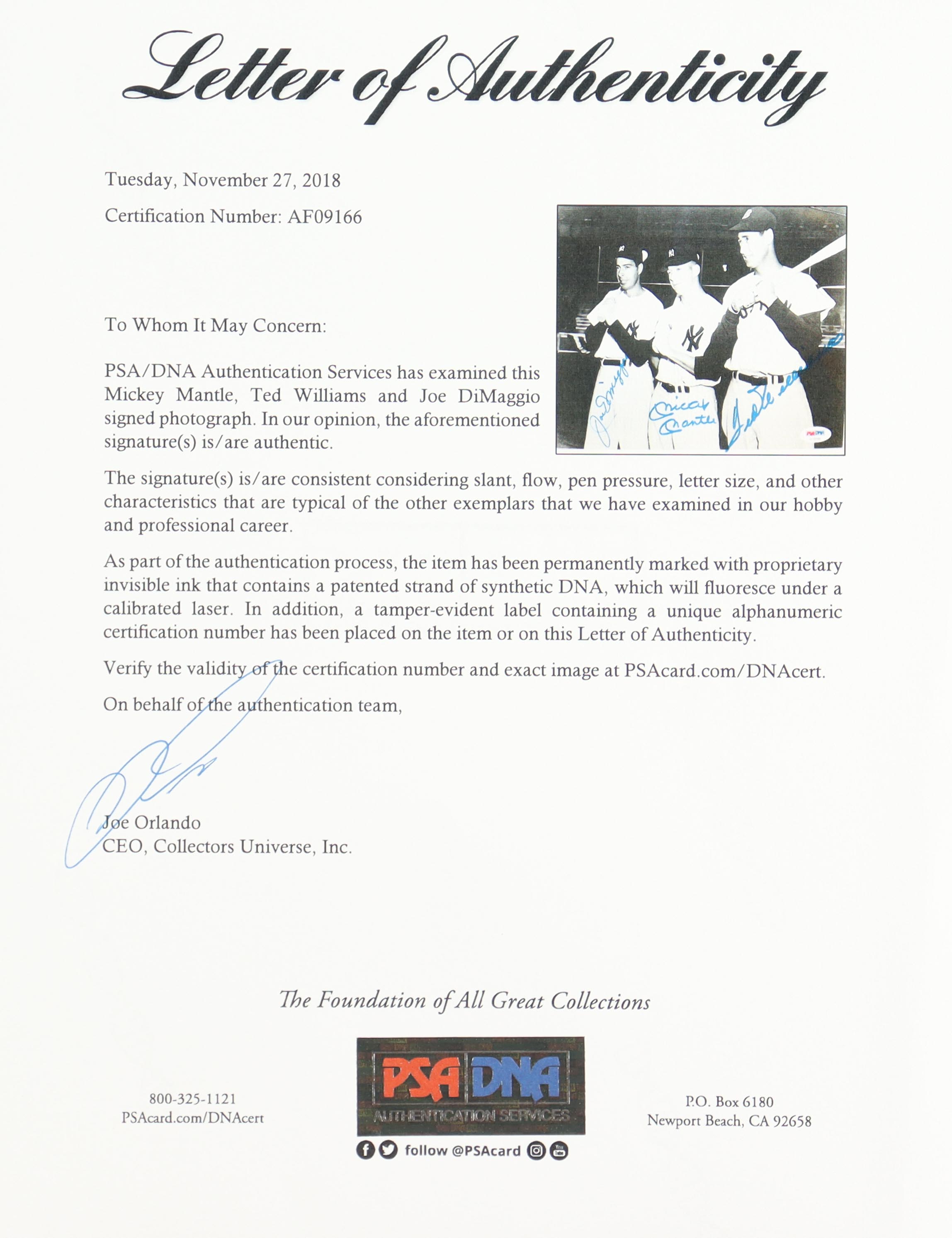 Mickey Mantle, Ted Williams & Joe DiMaggio Signed 8x10 Photo (PSA)