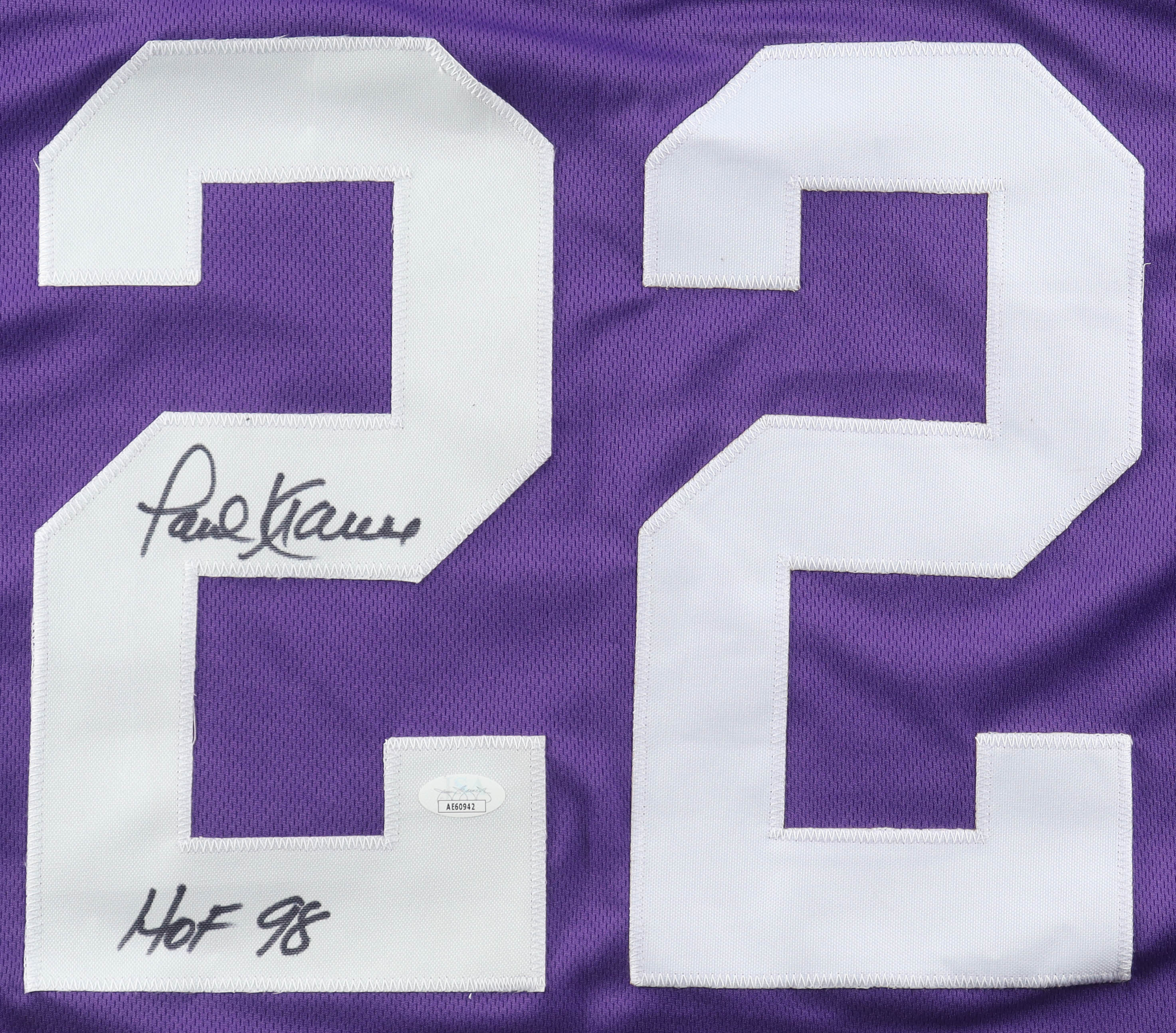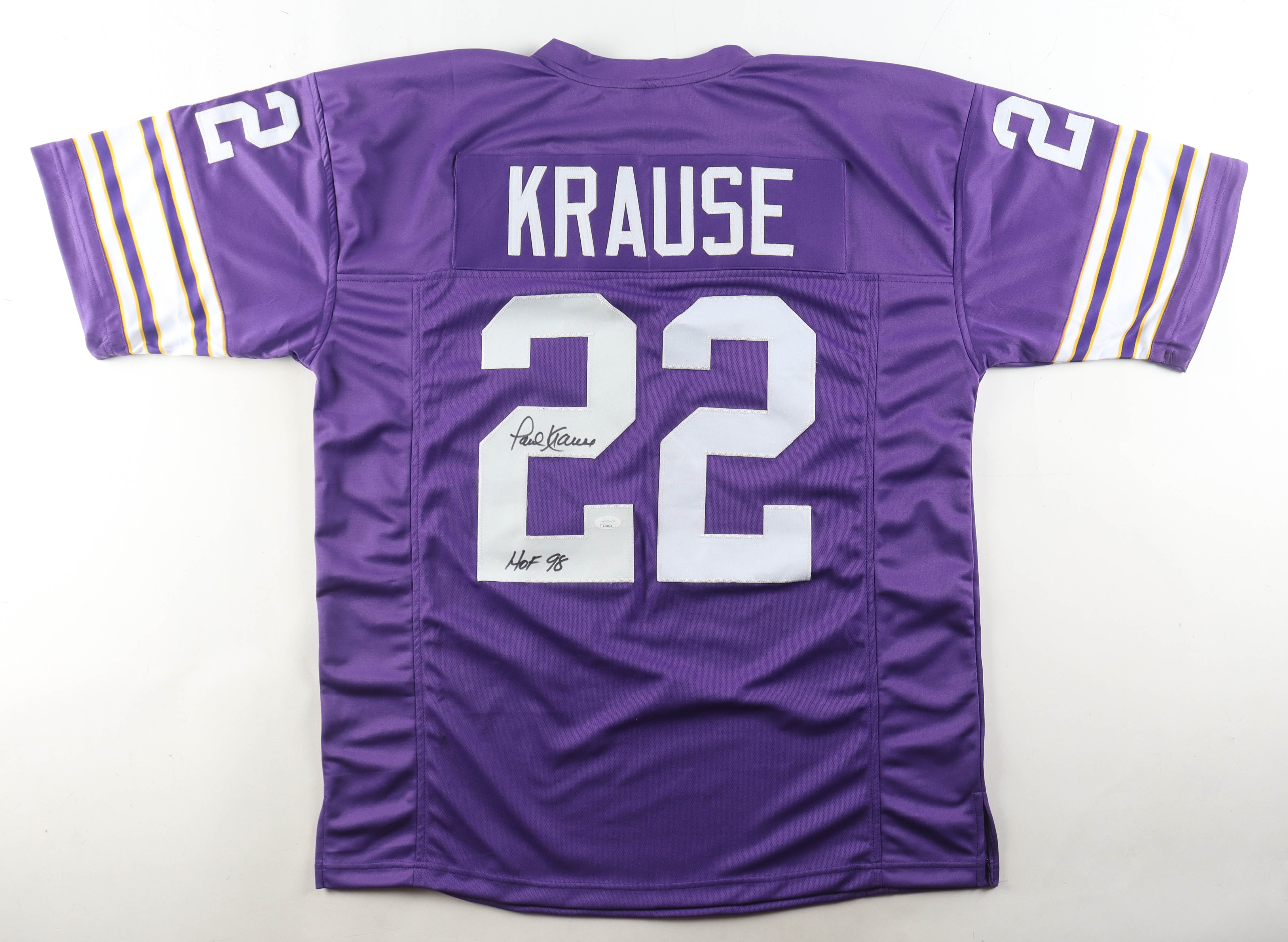 Custom jersey. Everything is sewn on, size XL. Has been hand-signed and inscribed by Paul Krause (HOF).