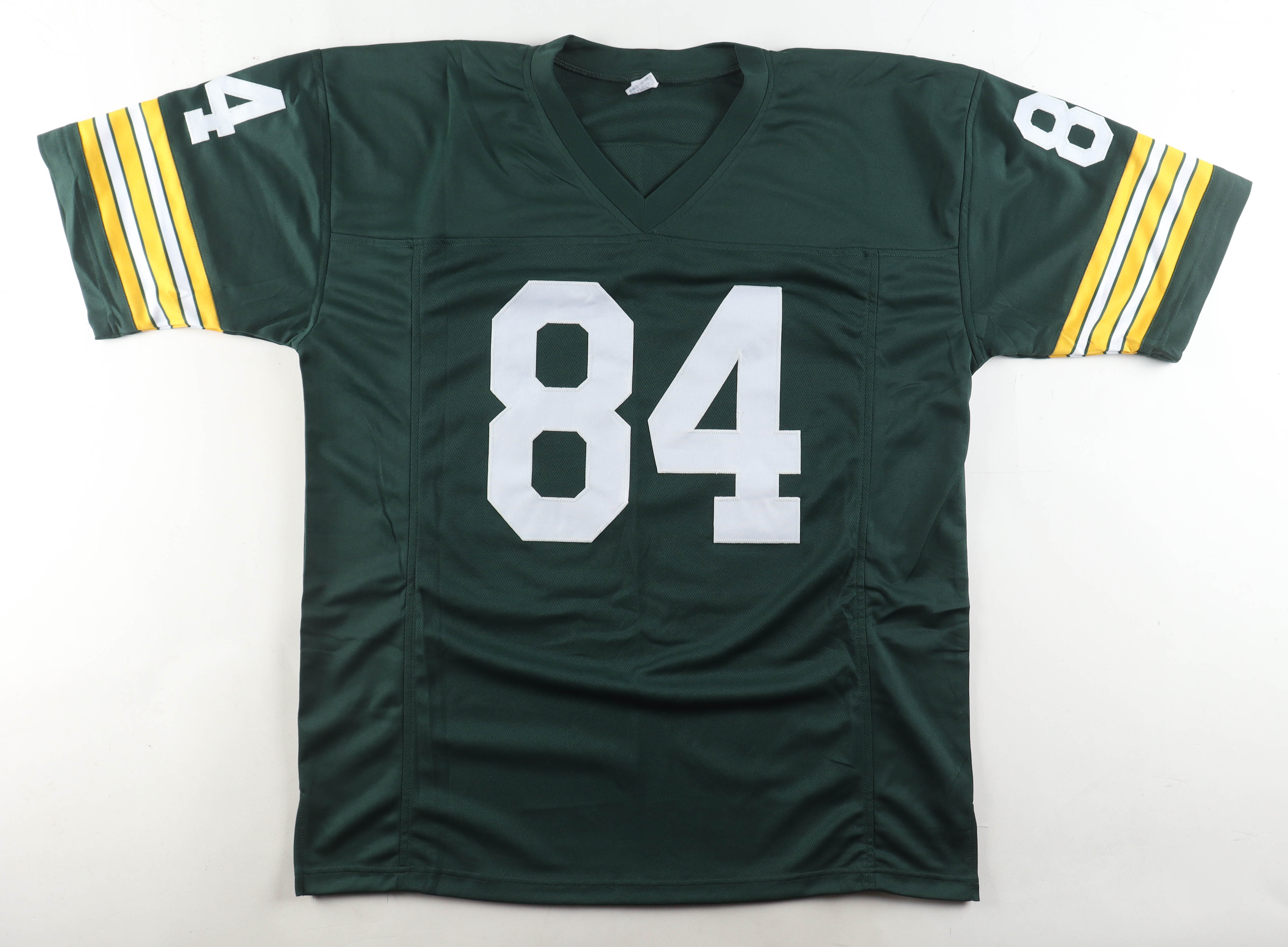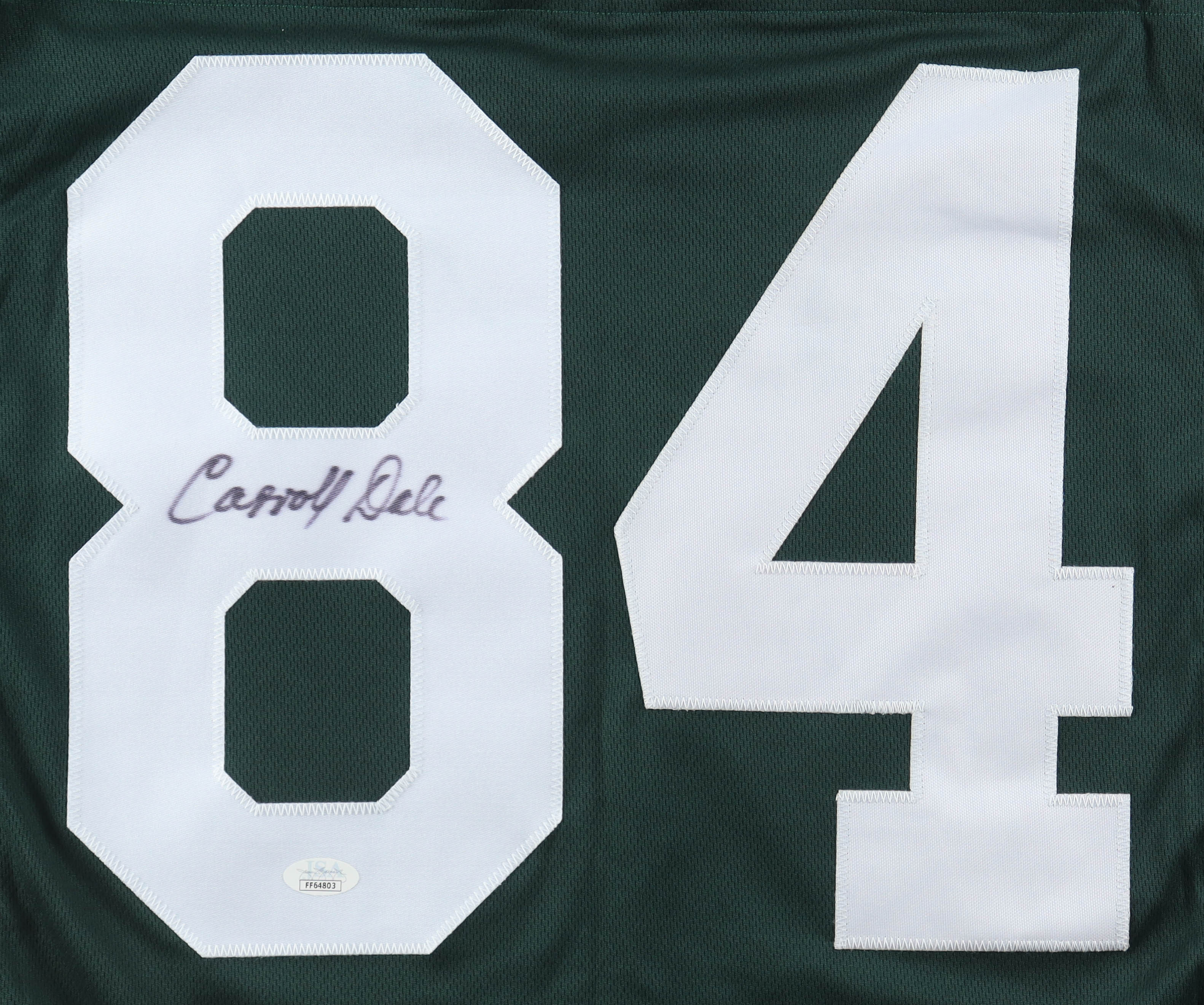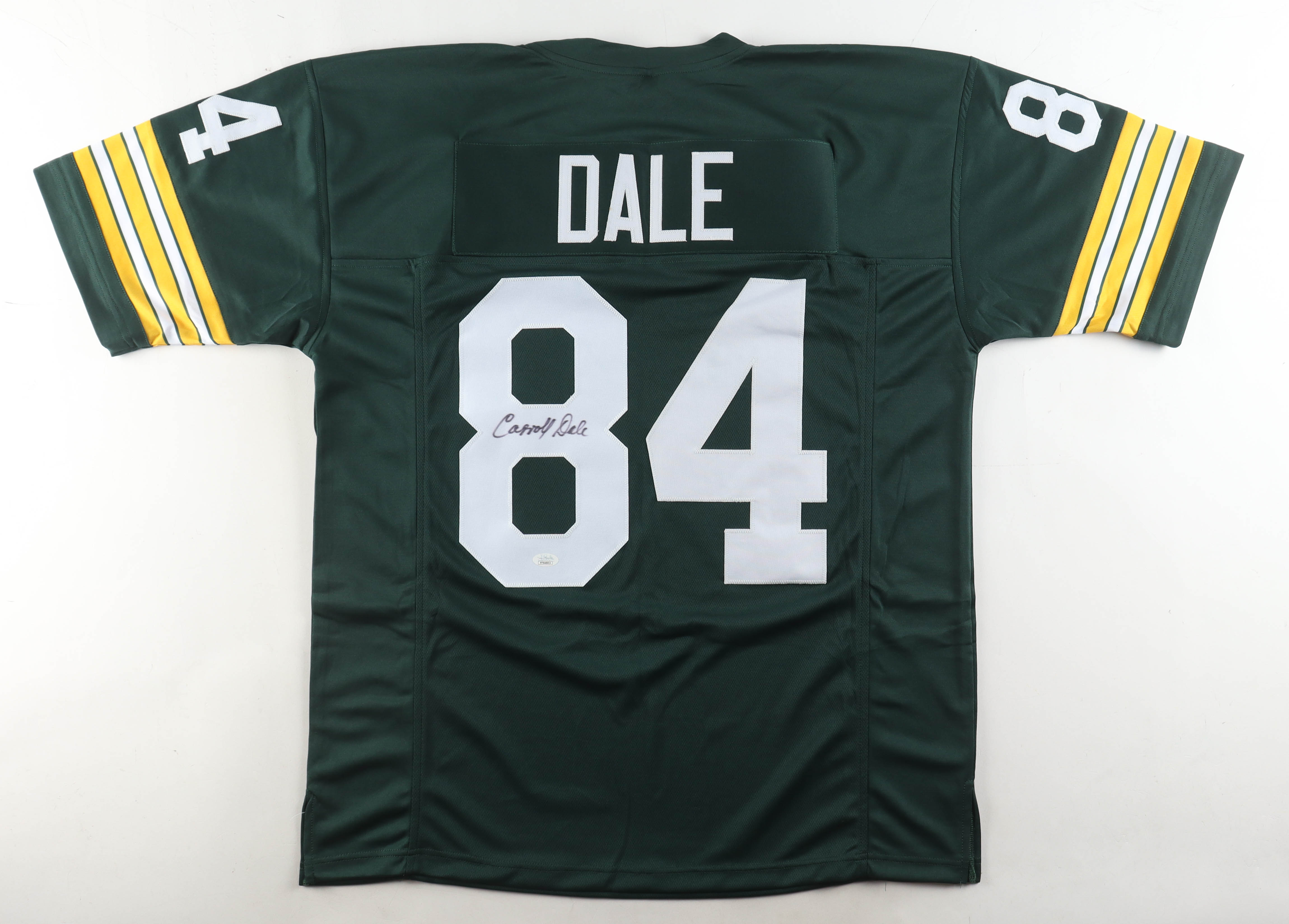 Custom jersey. Everything is sewn on, size XL. Hand-signed by Carroll Dale. Please note, the signature ink has bled.