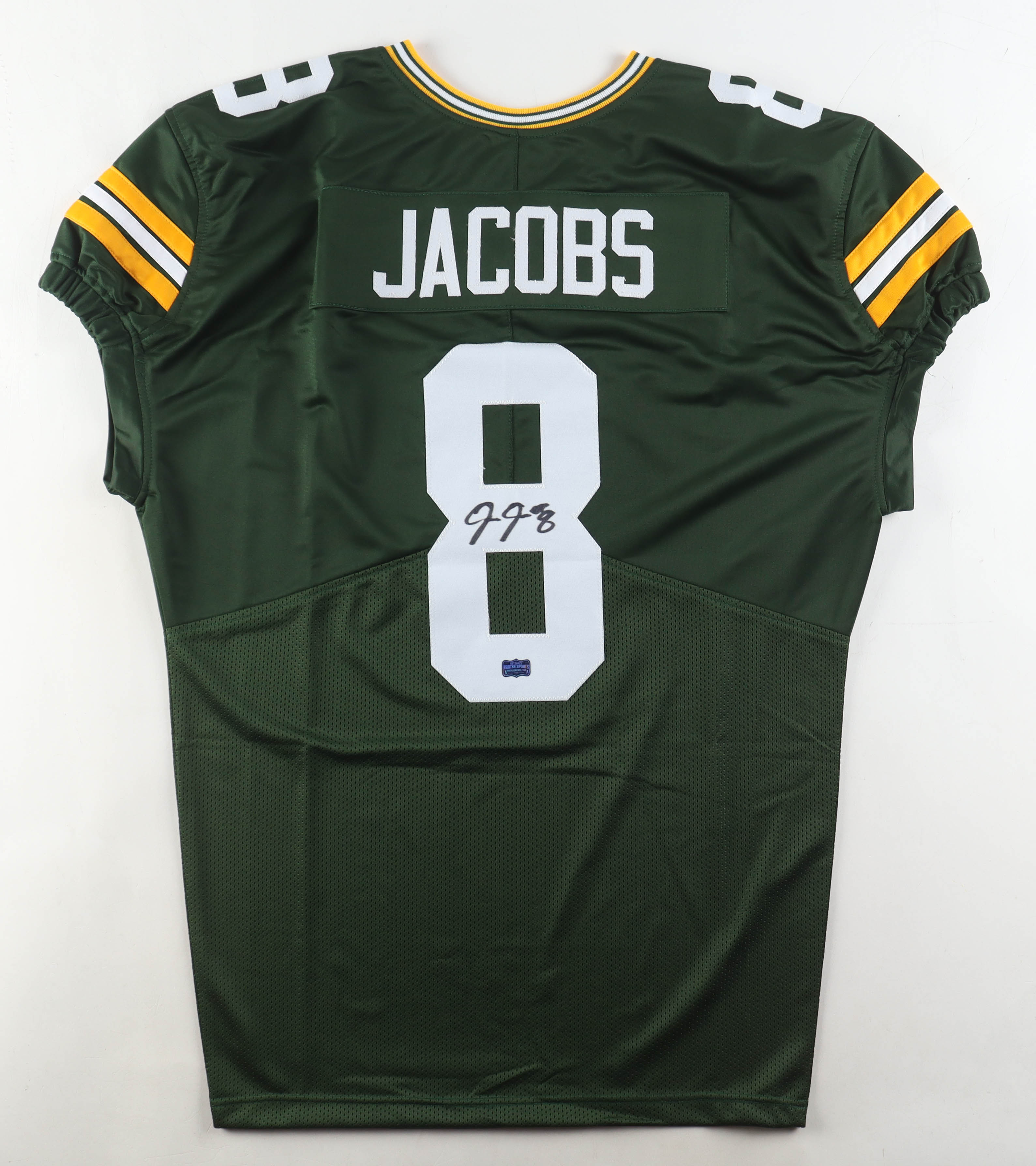 Custom jersey with everything sewn on, size XL. Hand-signed by Josh Jacobs.