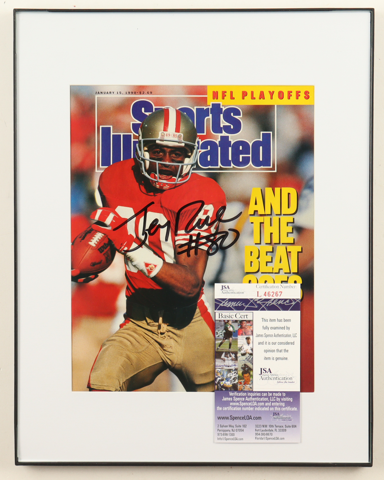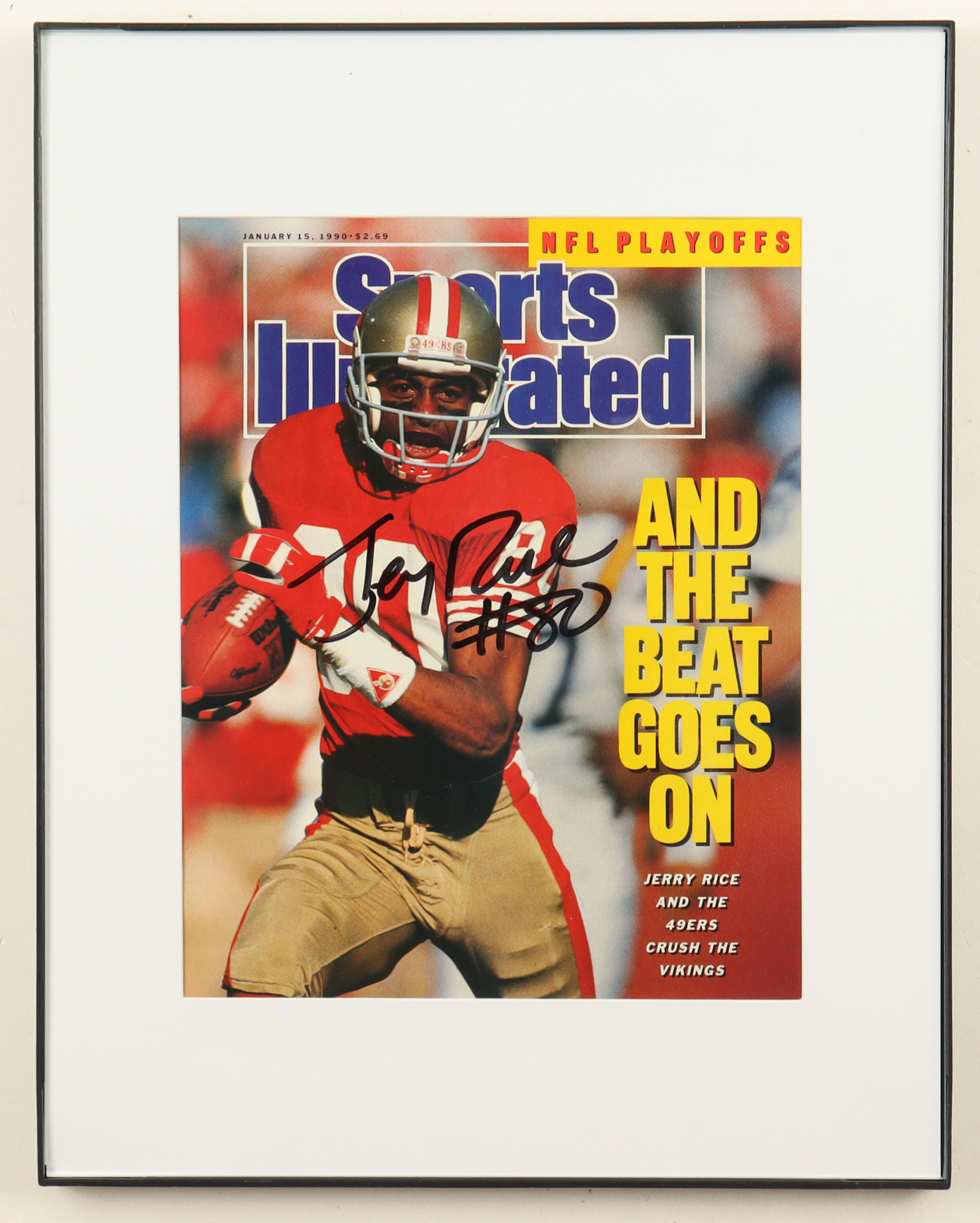Custom frame measures 11" x 214" in size. Display features a January 1990 Sports Illustrated magazine cover that has been hand-signed by Jerry Rice (San Francisco 49ers, HOF).