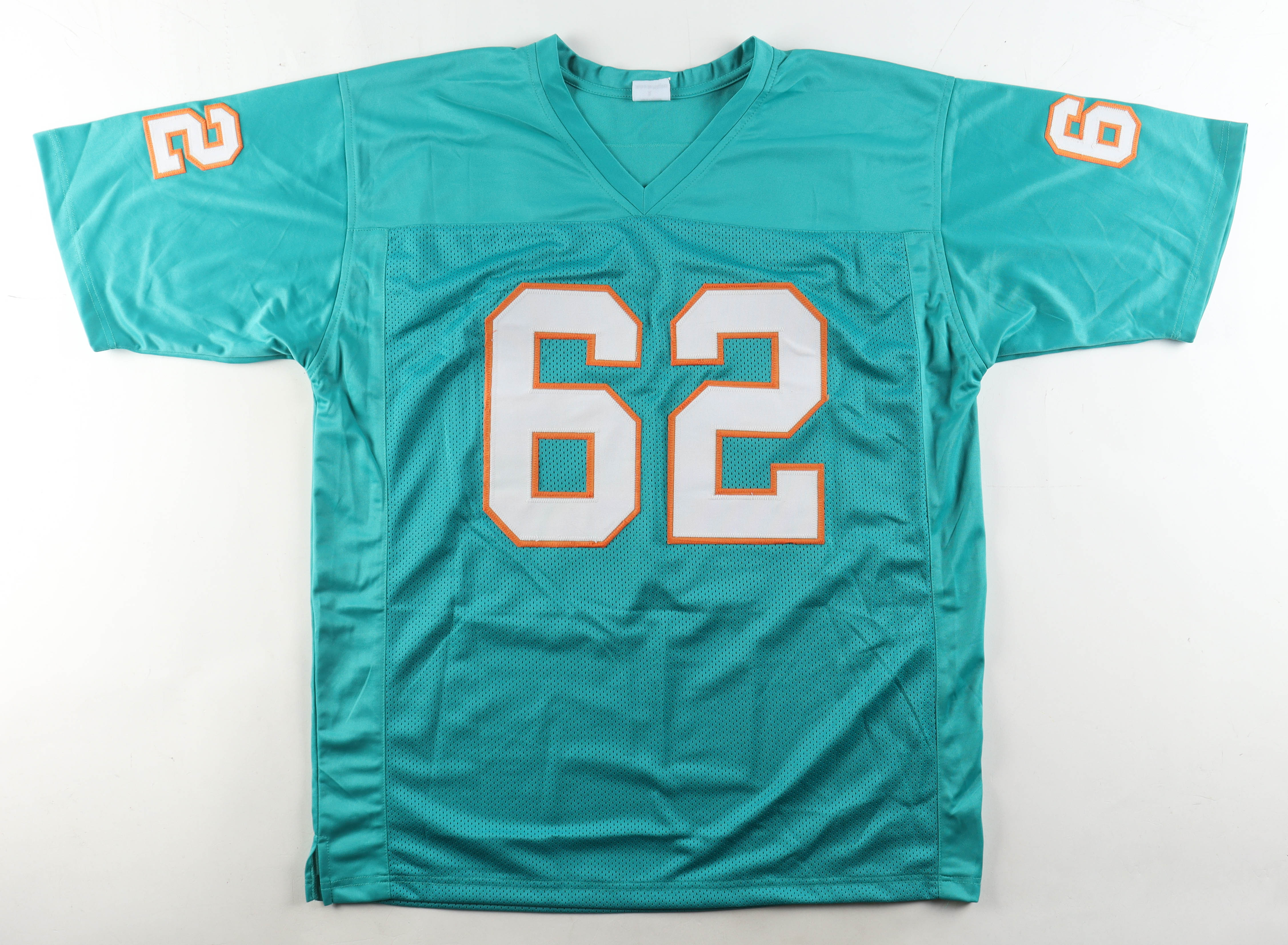 Custom jersey with everything sewn on, size XL. Hand-signed and inscribed by Jim Langer (D. 2019, HOF). Please note, the signature and inscription have bled.