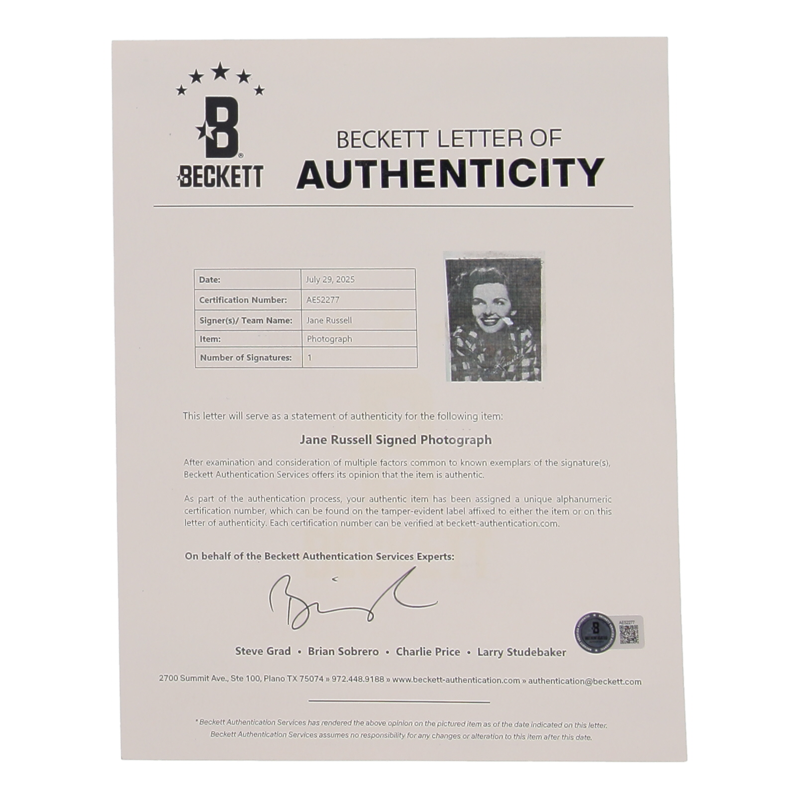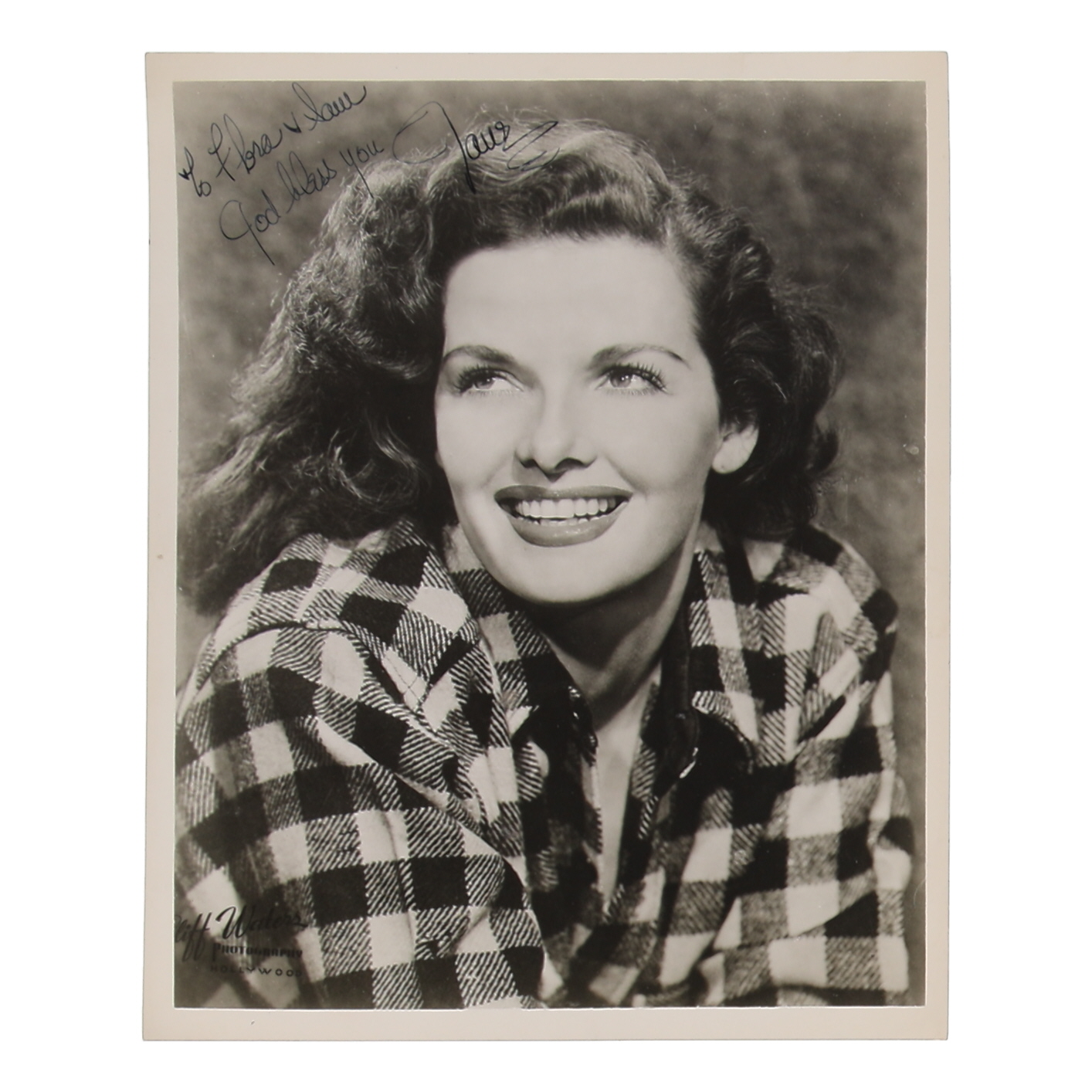 Photo measures 8" x 10" in size. Hand-signed by Jane Russell. Please note, there is a personalization.
