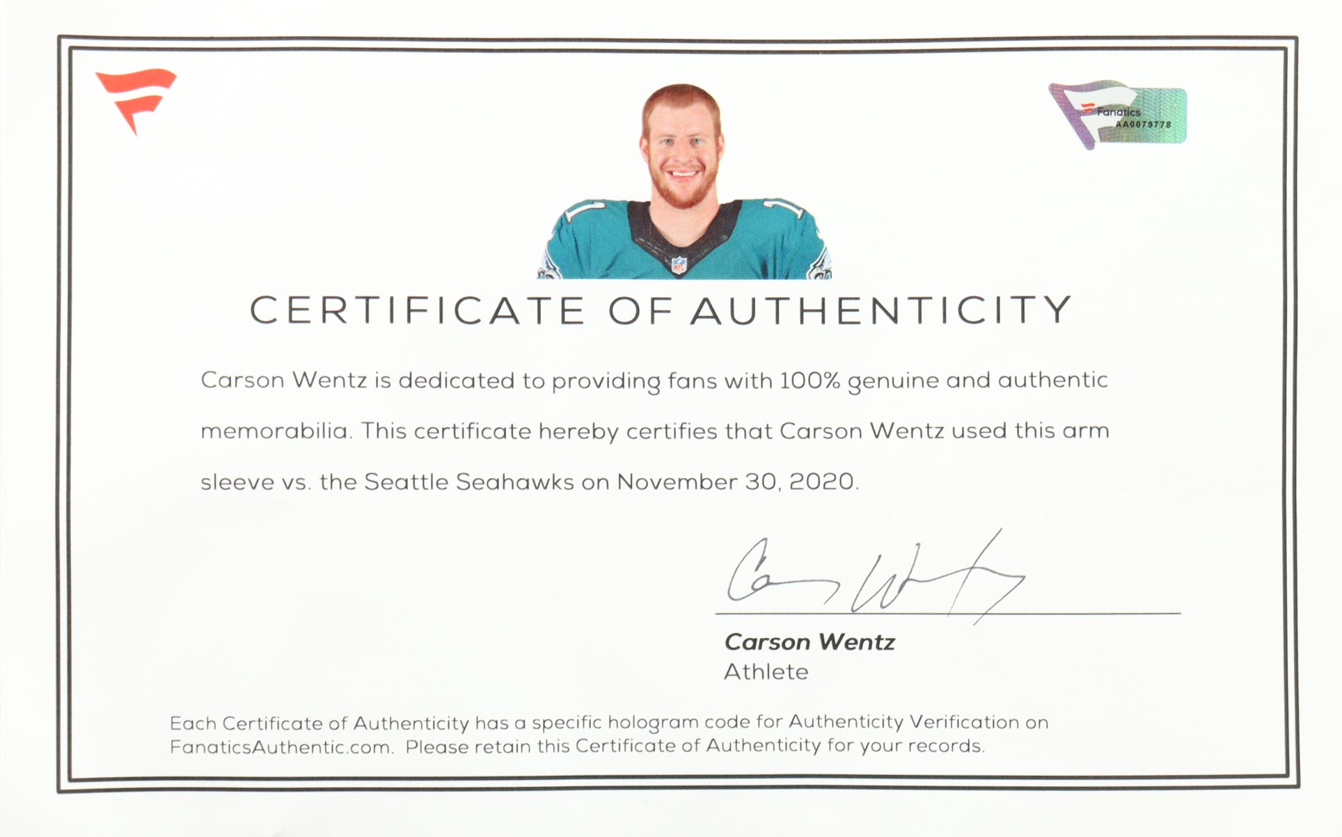 Arm sleeve was game-used by Carson Wentz (Philadelphia Eagles) against the Seattle Seahawks on November 30, 2020.