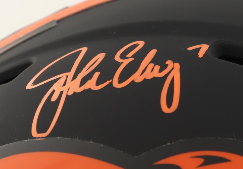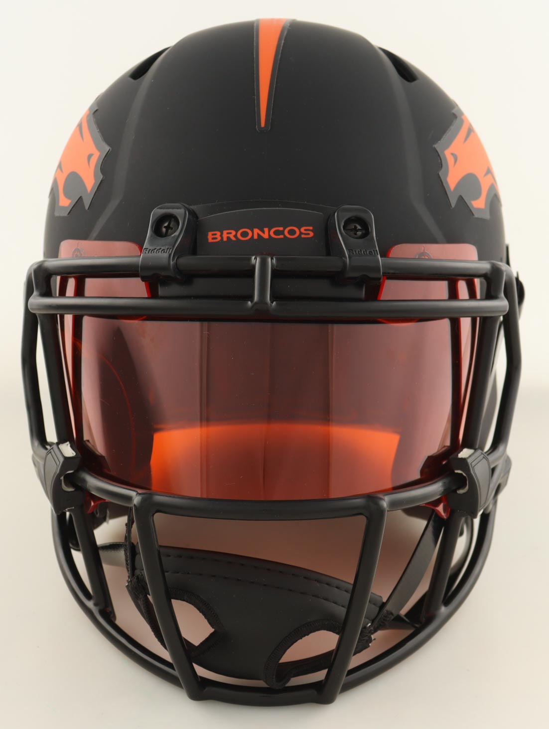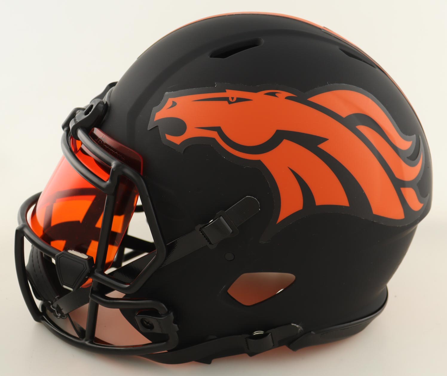 Riddell Denver Broncos full-size authentic on-field eclipse alternate speed helmet with a visor has been hand-signed by John Elway (HOF).