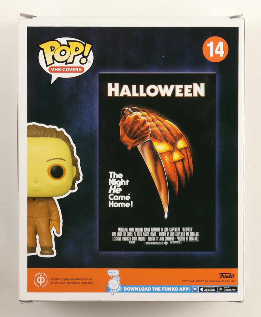 Funko Pop! vinyl figure measures approximately 4" tall. Hand-signed and inscribed on the packaging by Nick Castle (Michael Meyers). Please note, packaging has been creased. Please see photos for more details.