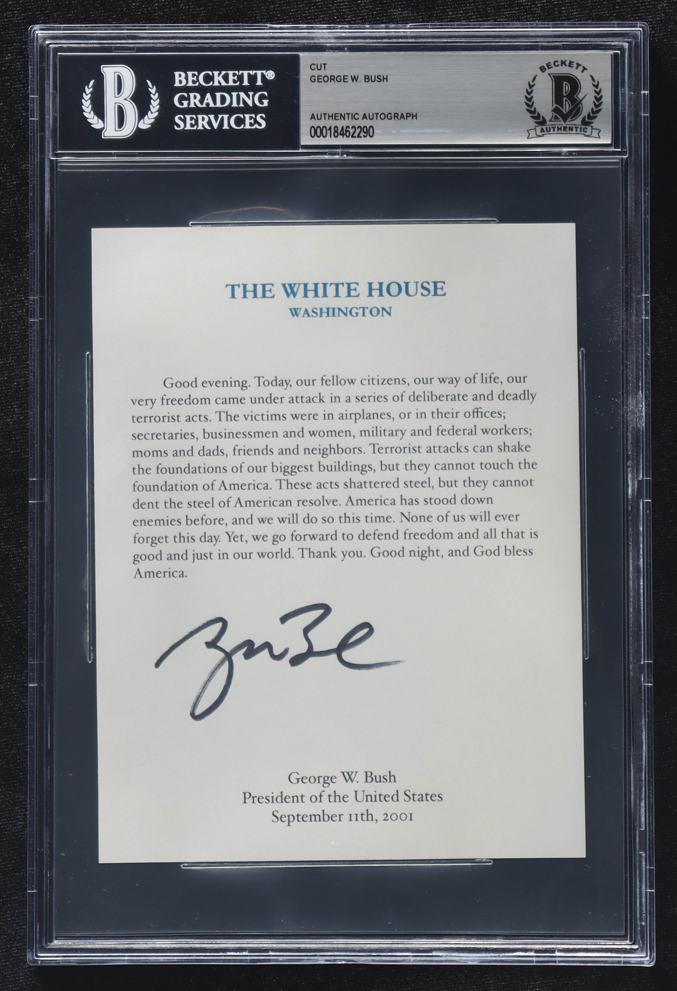 Cut measures 5" x 6" in size. Hand-signed by George W. Bush. Please see photos for details regarding the condition of the cut.