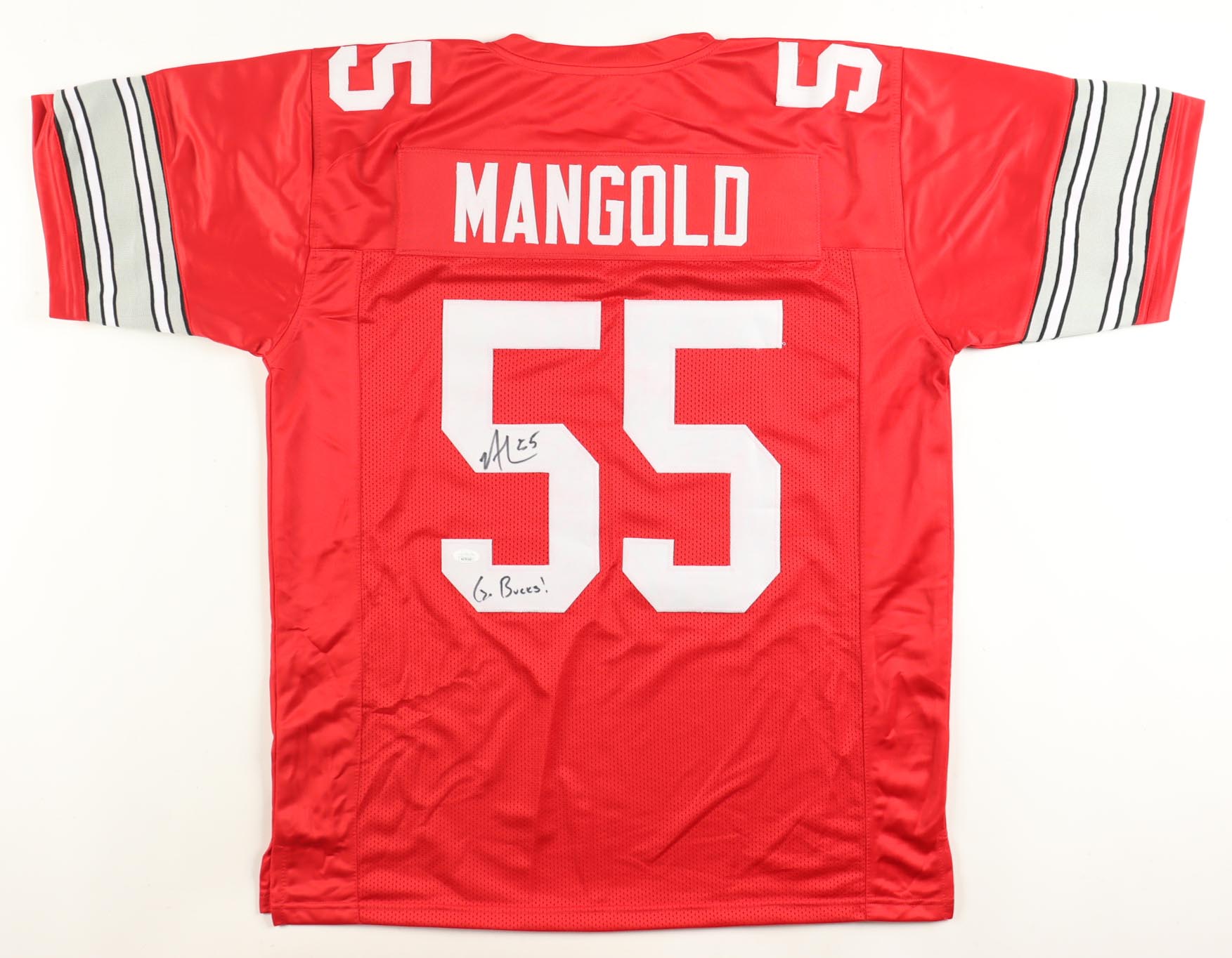 Custom jersey with everything sewn on, size XL. Hand-signed and inscribed by Nick Mangold (Ohio State Buckeyes).