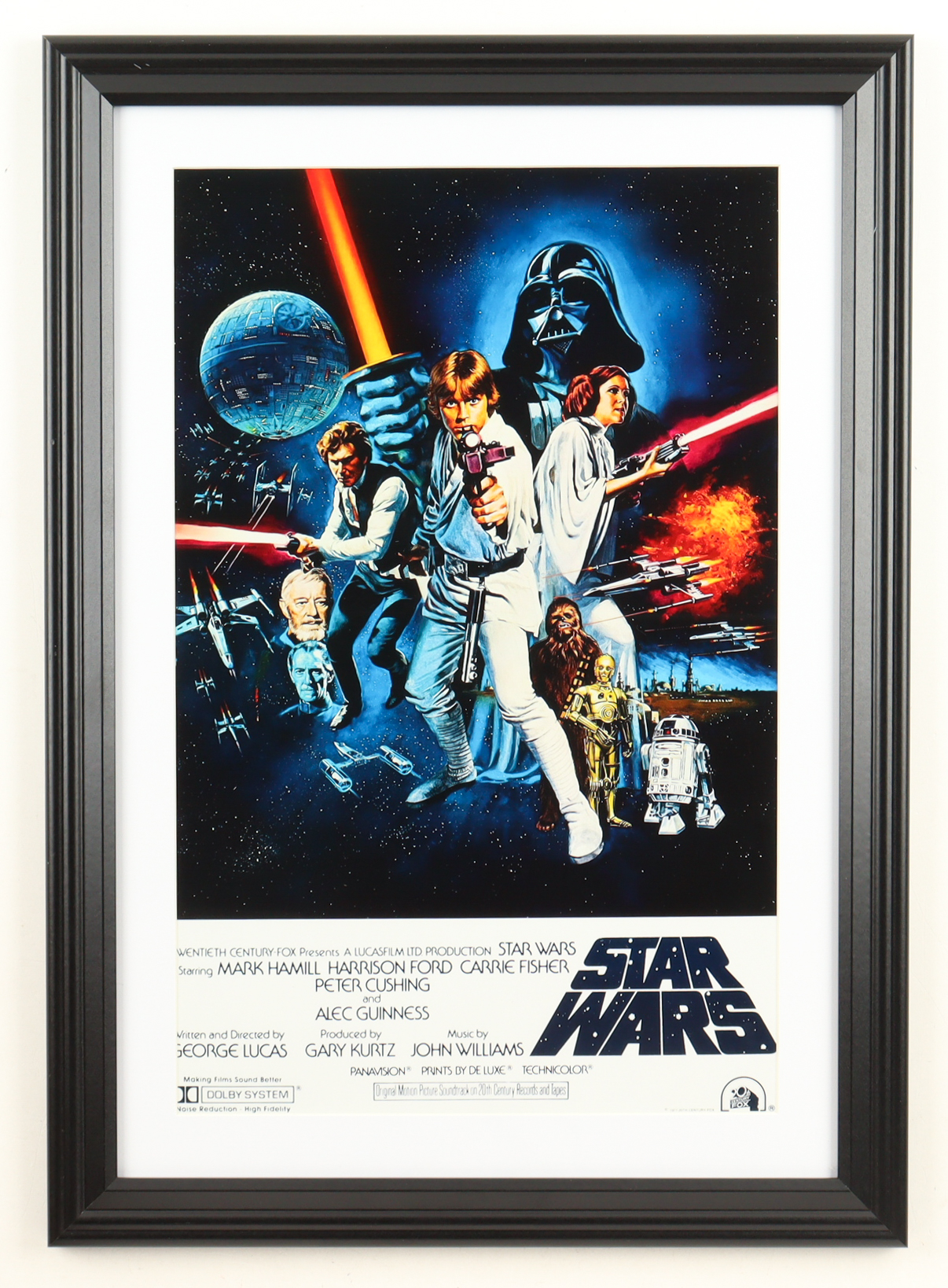 Custom frame measures approximately 15" x 21" in size. The display features a Star Wars: A New Hope 1977 print. Please note frame is unsigned.