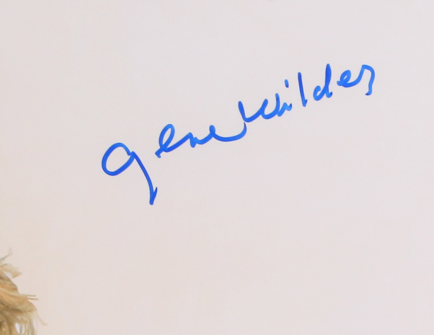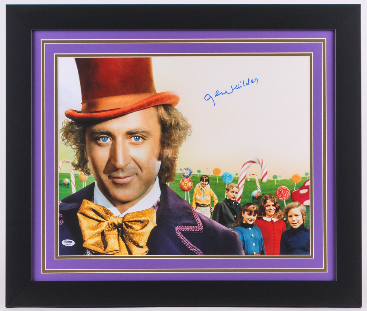 Custom framed poster print measures 23.5" x 27.5" in size and has been hand-signed in blue felt-tip pen by Gene Wilder (D. 2016).