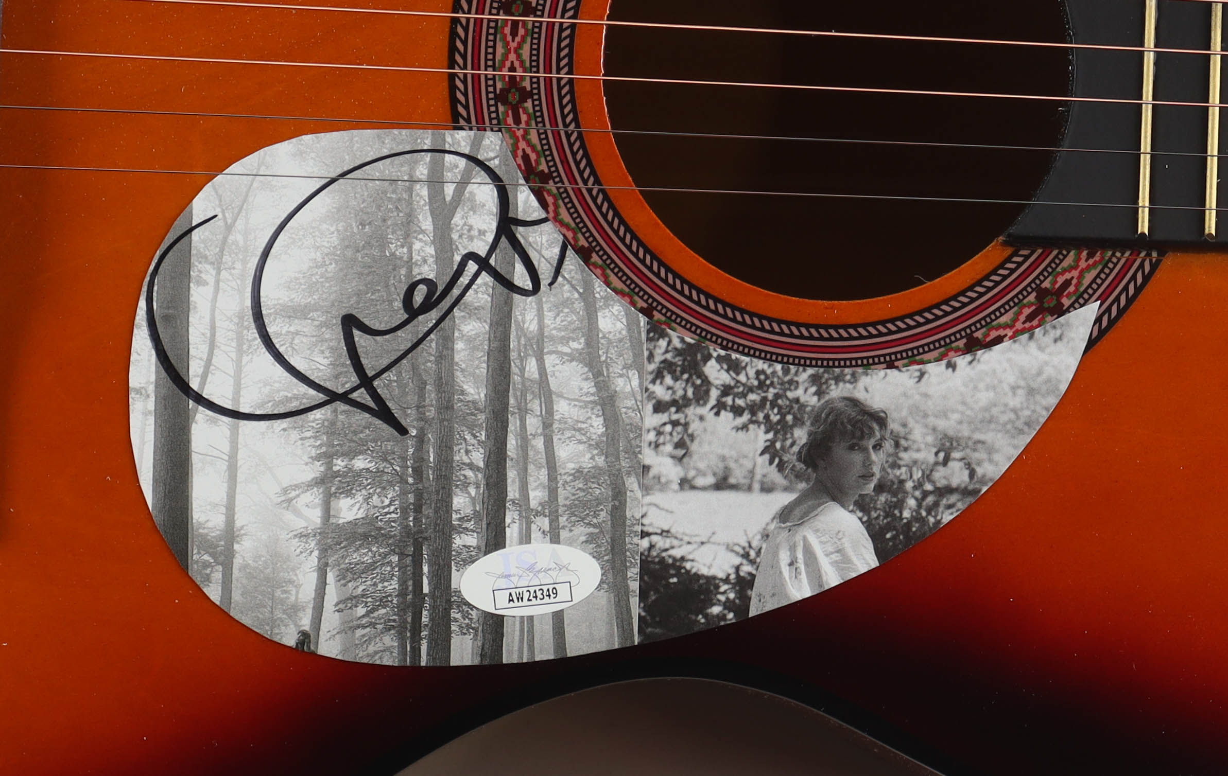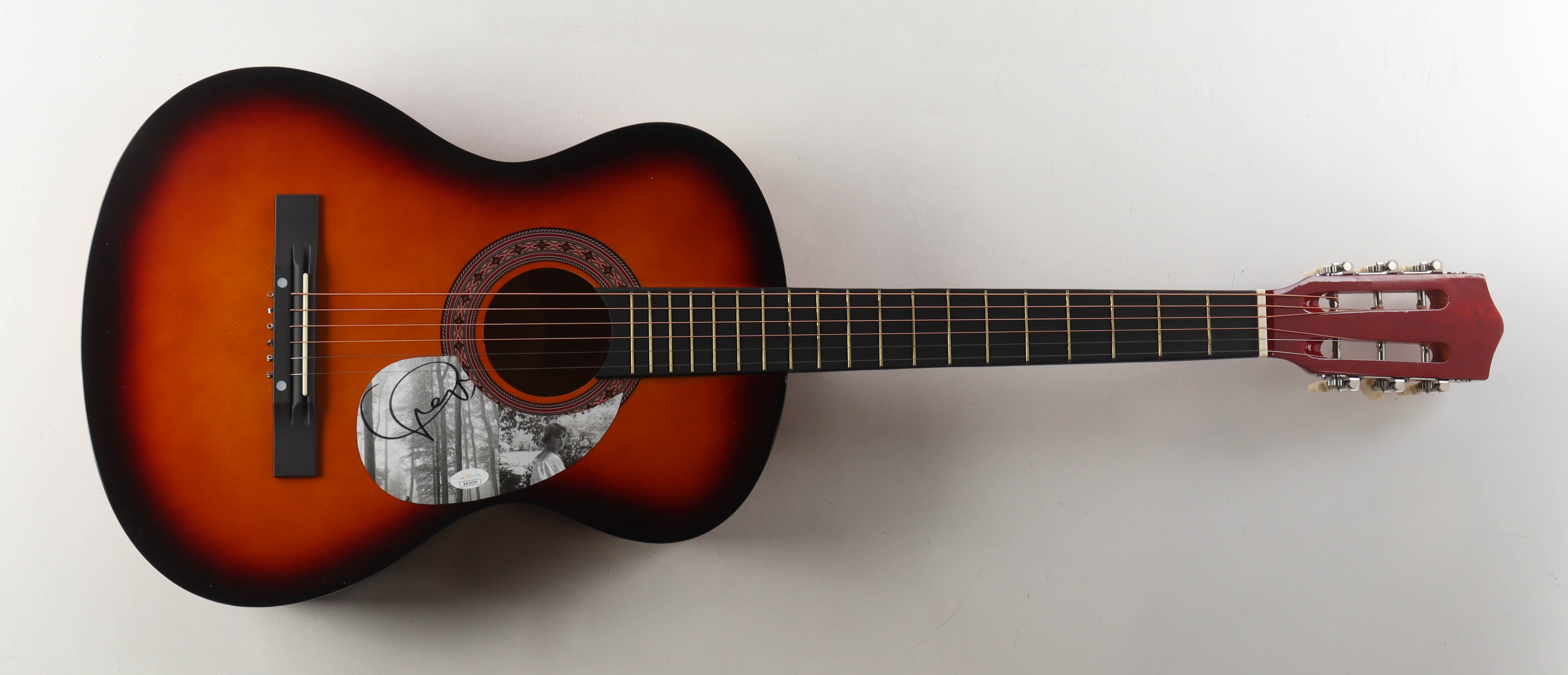 Acoustic guitar measures approximately 38" in length and has been hand-signed on a CD cover that has been repurposed as a pick-guard by Taylor Swift.