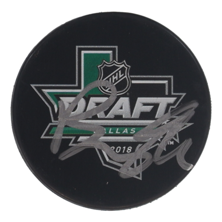 2018 NHL Draft logo hockey puck. Hand-signed by Brady Tkachuk (Ottawa Senators).