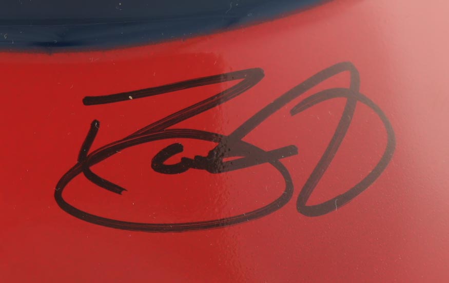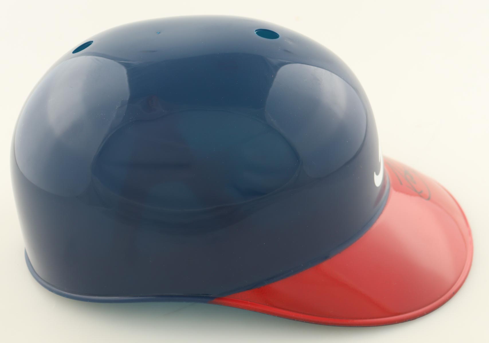 Atlanta Braves full-size replica plastic souvenir batting helmet has been hand-signed by David Justice.