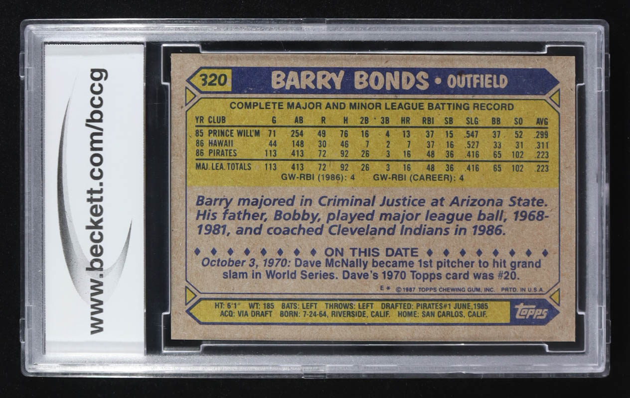 Barry Bonds 1987 Topps #320 RC (BCCG 10)
