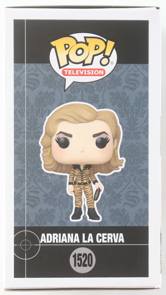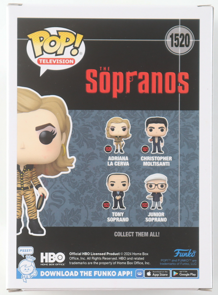 Funko pop! vinyl figure measures approximately 4" tall. Hand-signed on the packaging by Drea de Matteo (Adriana La Cerva).