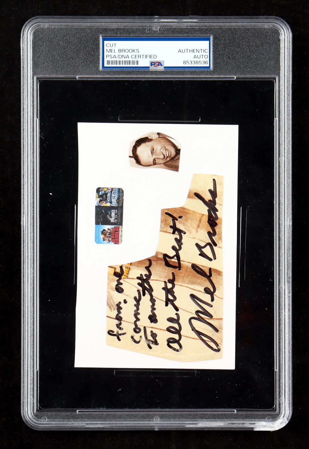 Cut is hand-signed and inscribed by Mel Brooks.