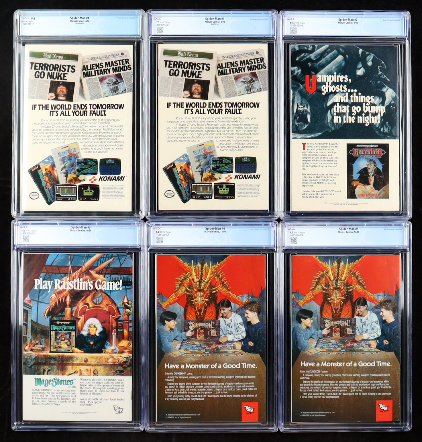 Complete Set includes (6) "Spider-Man" comics. The comic books have been graded (CGC) 9.6, 7.5, 8.0, 8.5, 9.2, and 9.0. Please see photos for more details regarding the condition of the comics.