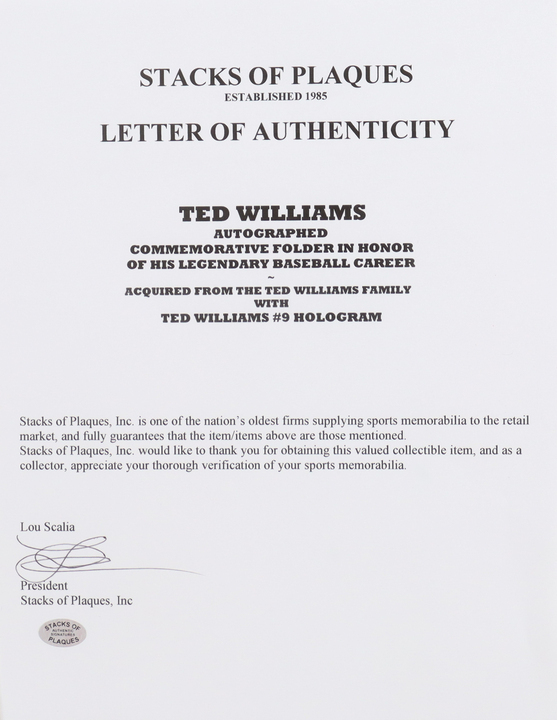The autograph(s) includes an official Stacks of Plaques - Est. 1985, celebrating 35 years in the business - hologram as well as an official Ted Williams player hologram for authenticity purposes.