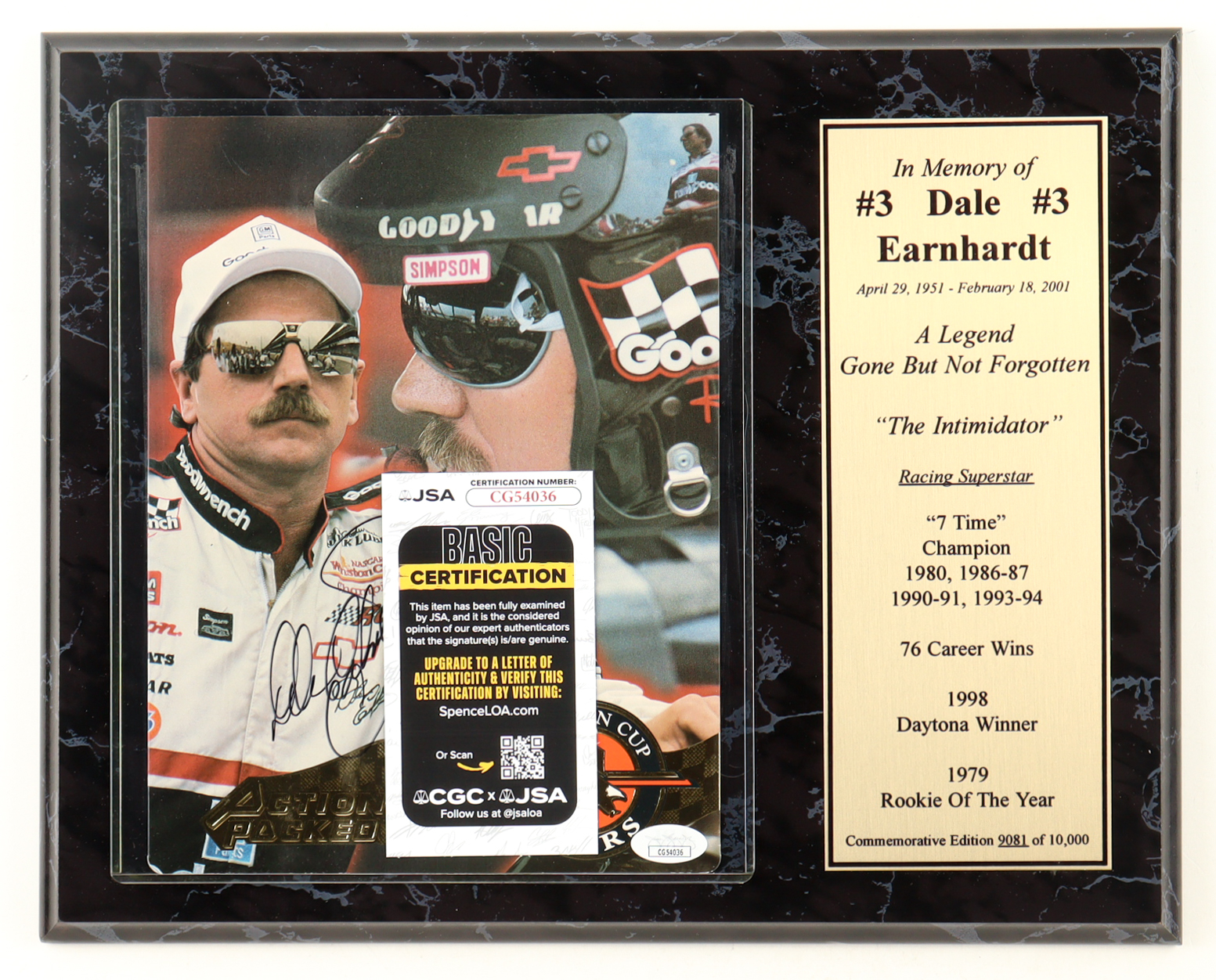 Custom plaque measures 15" x 12" in size and features a photo that has been hand-signed by Dale Earnhardt Sr. (d. 2001). Plaque also includes a career statistics plaque.