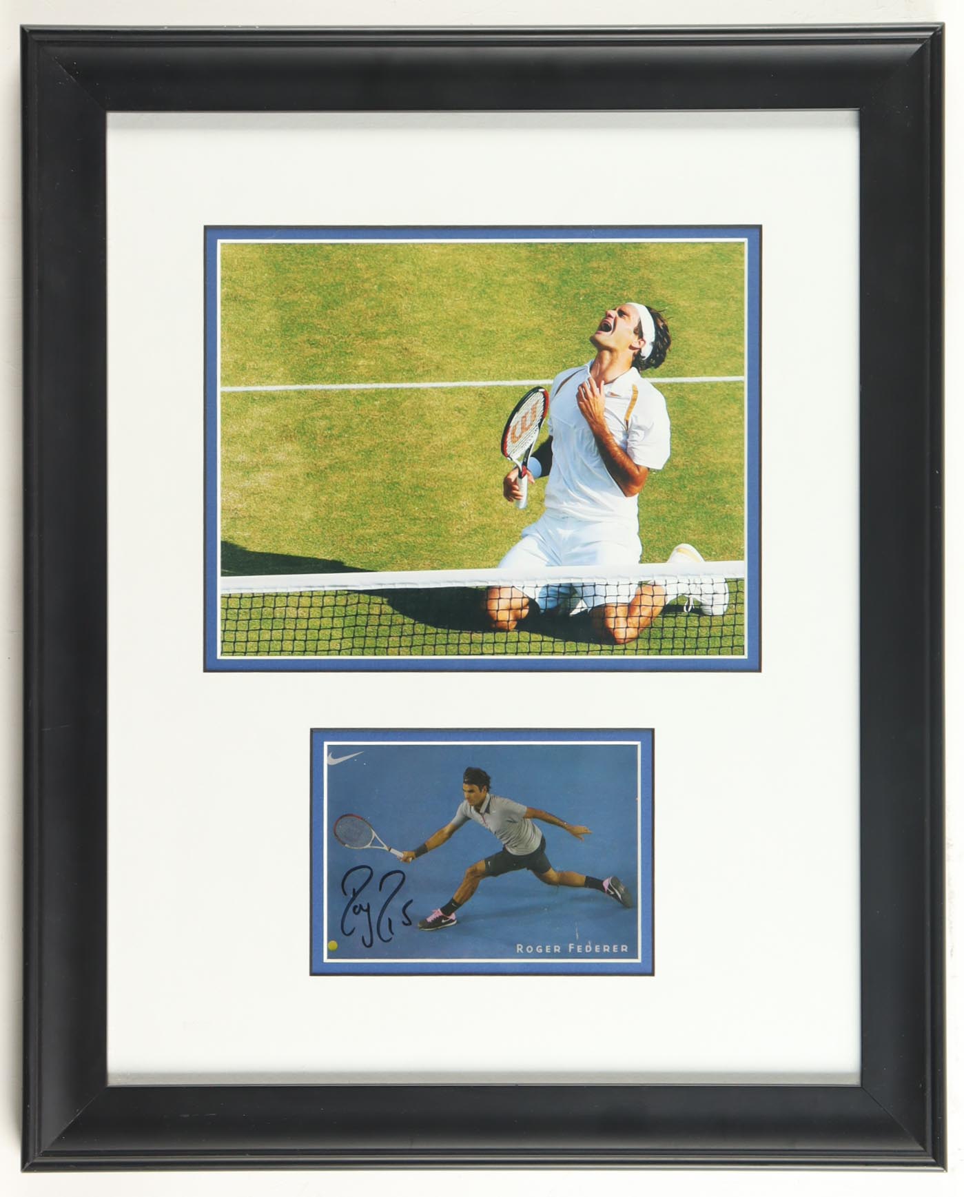 Custom frame measures 16.5" x 20.5" in size. 4" x 6" photograph has been hand-signed by Roger Federer. Display also includes an unsigned 8" x 10" photograph.
