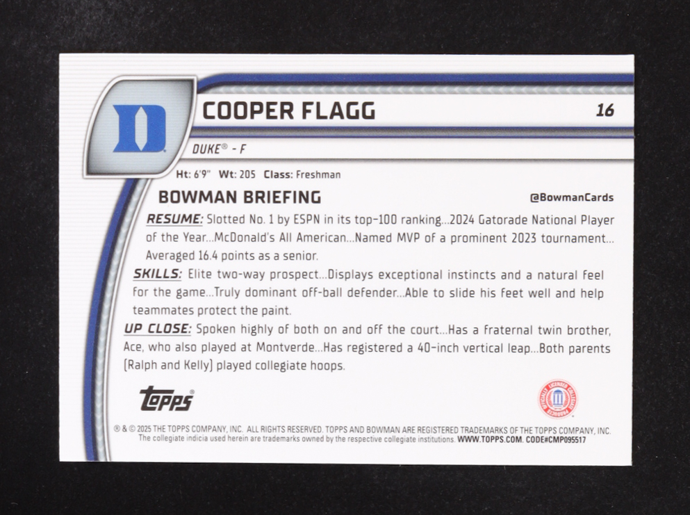 Cooper Flagg 2024-25 Bowman Chrome Sapphire University #16 RC
