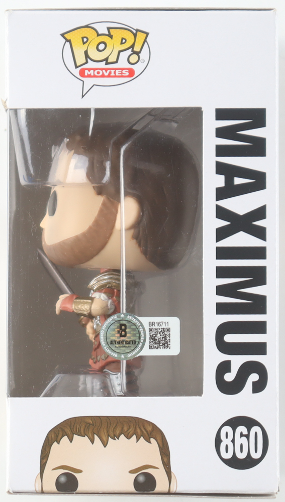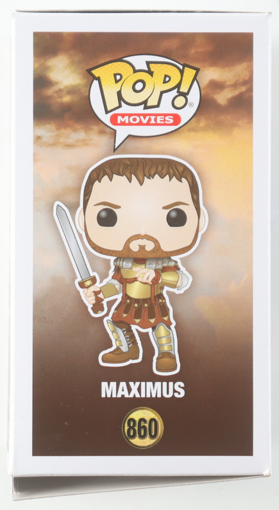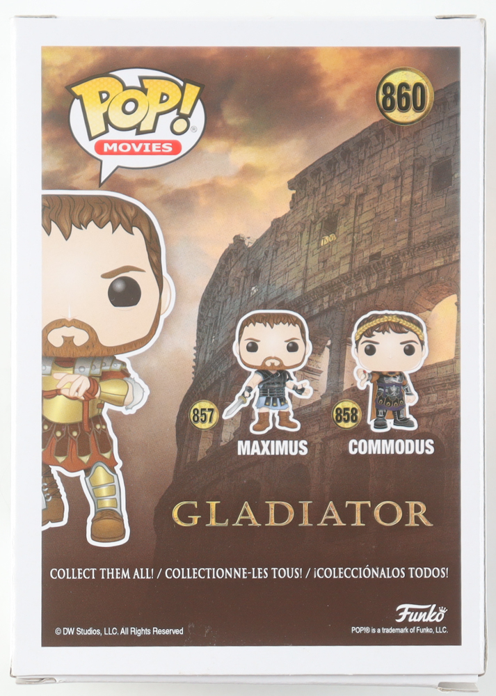 Funko Pop! figure measures approximately 4" tall. Hand-signed on the packaging by Russell Crowe (Maximus).