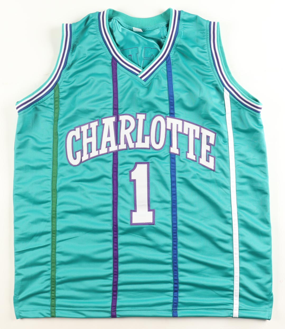 Custom jersey with everything sewn on, size XL. Hand-signed by Muggsy Bogues. Please note, the signature has bled.