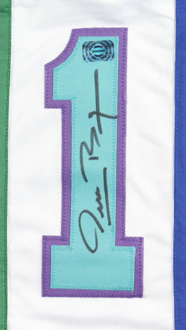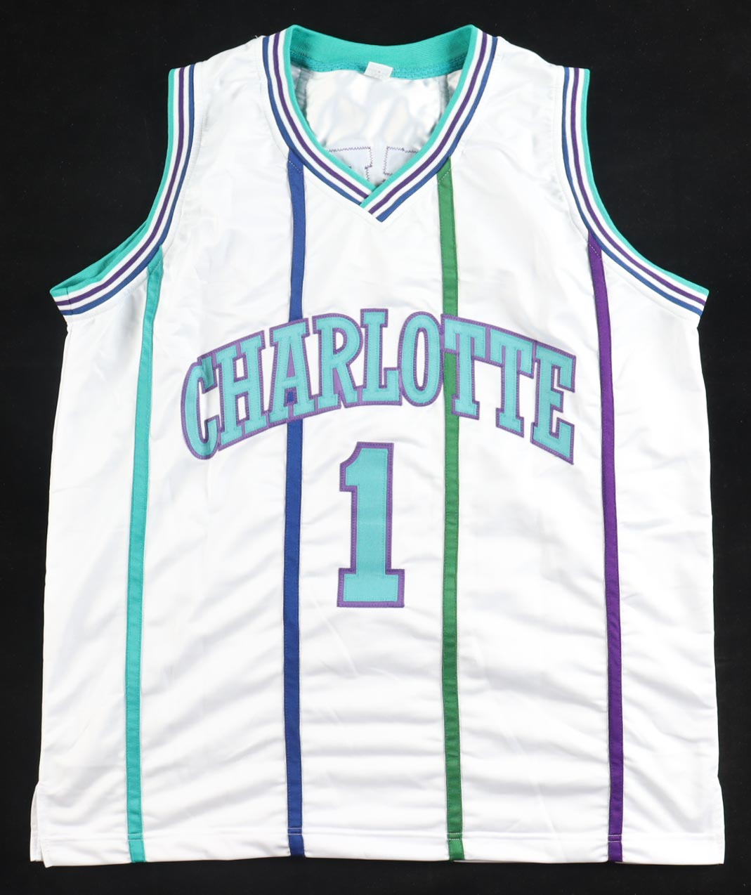Custom jersey with everything sewn on, size XL. Hand-signed by Muggsy Bogues.