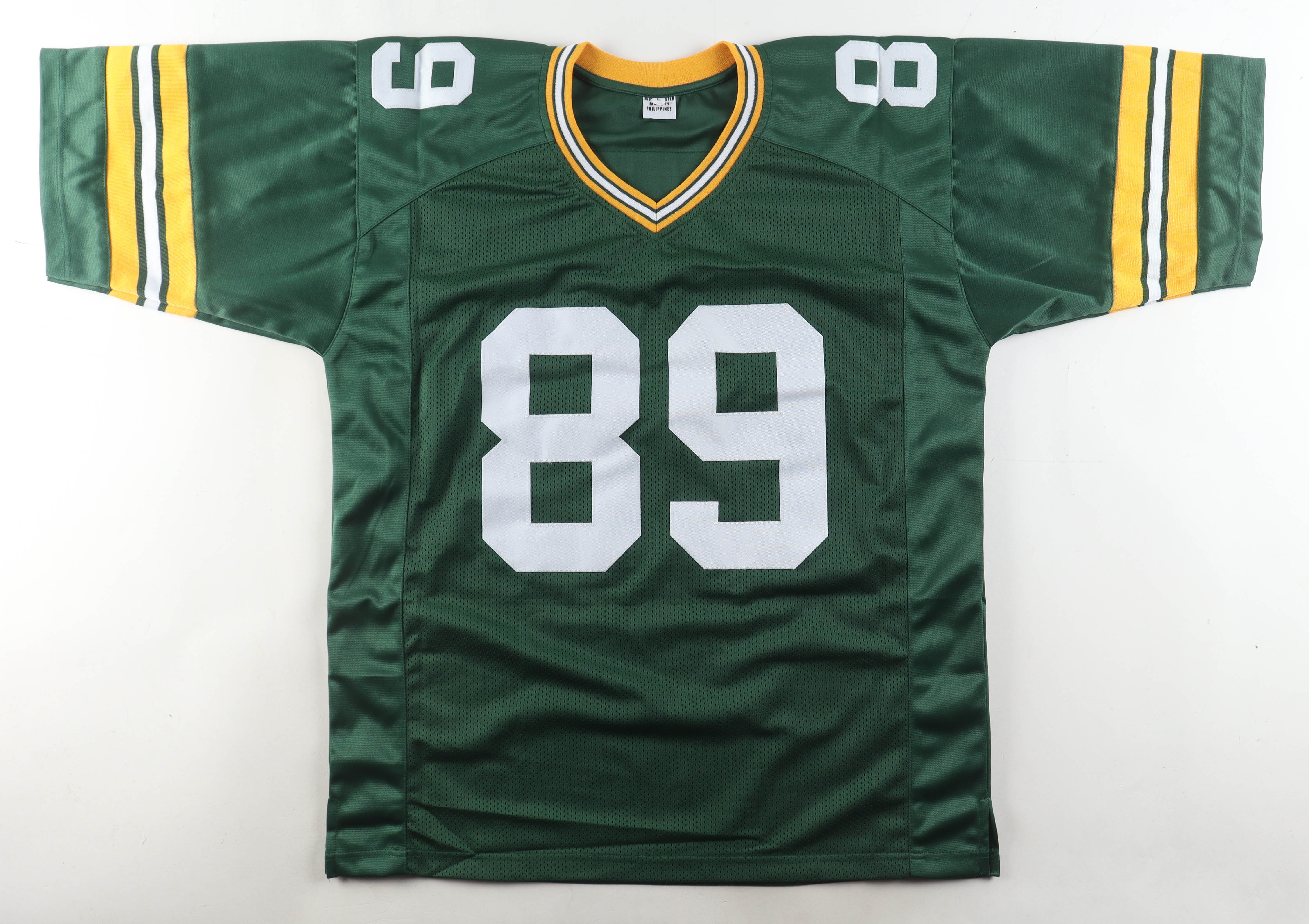 Custom jersey with everything sewn on, size XL. Hand-signed and inscribed by Dave Robinson (HOF). Please note, the signature and inscription have bled.
